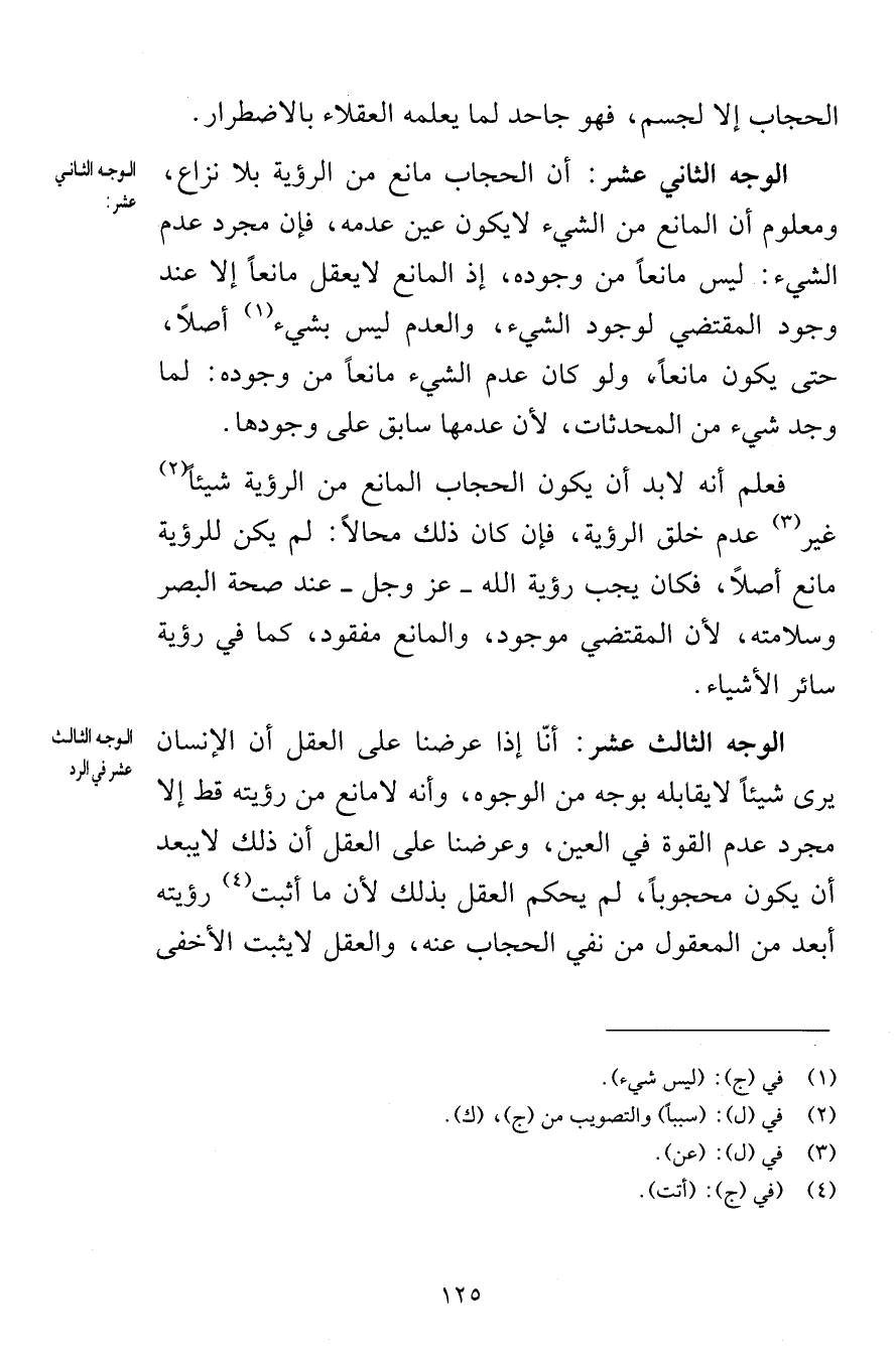 الحجاب إلا لجسم فهو جاحد لما يعلمه العقلاء بالاضطرار الوجه الثاني عشر أن الحجاب مانع من الرؤية بلا نزاع ومعلوم أن المانع من الشيء لا يكون عين عدمه فإن مجرد عدم الشيء ليس مانعاً من وجوده إذ المانع لا يعقل مانعاً إلا عند وجود المقتضي لوجود الشيء والعدم ليس بشيء أصلاً حتى يكون مانعاً ولو كان عدم الشيء مانعاً من وجوده لما وجد شيء من المحدثات لأن عدمها سابق على وجودها فعلم أنه لابد أن يكون الحجاب المانع من الرؤية شيئاً غير عدم خلق الرؤية فإن كان ذلك محالاً لم يكن للرؤية مانع أصلاً فكان يجب رؤية الله عز وجل عند صحة البصر وسلامته لأن المقتضي موجود والمانع مفقود كما في رؤية سائر الأشياء الوجه الثالث عشر أنّا إذا عرضنا على العقل أن الإنسان يرى شيئاً لا يقابله بوجه من الوجوه وأنه لا مانع من رؤيته قط إلا مجرد عدم القوة في العين وعرضنا على العقل أن ذلك لا يبعد أن يكون محجوباً لم يحكم العقل بذلك لأن ما أثبت رؤيته أبعد من المعقول من نفي الحجاب عنه والعقل لا يثبت الأخفى