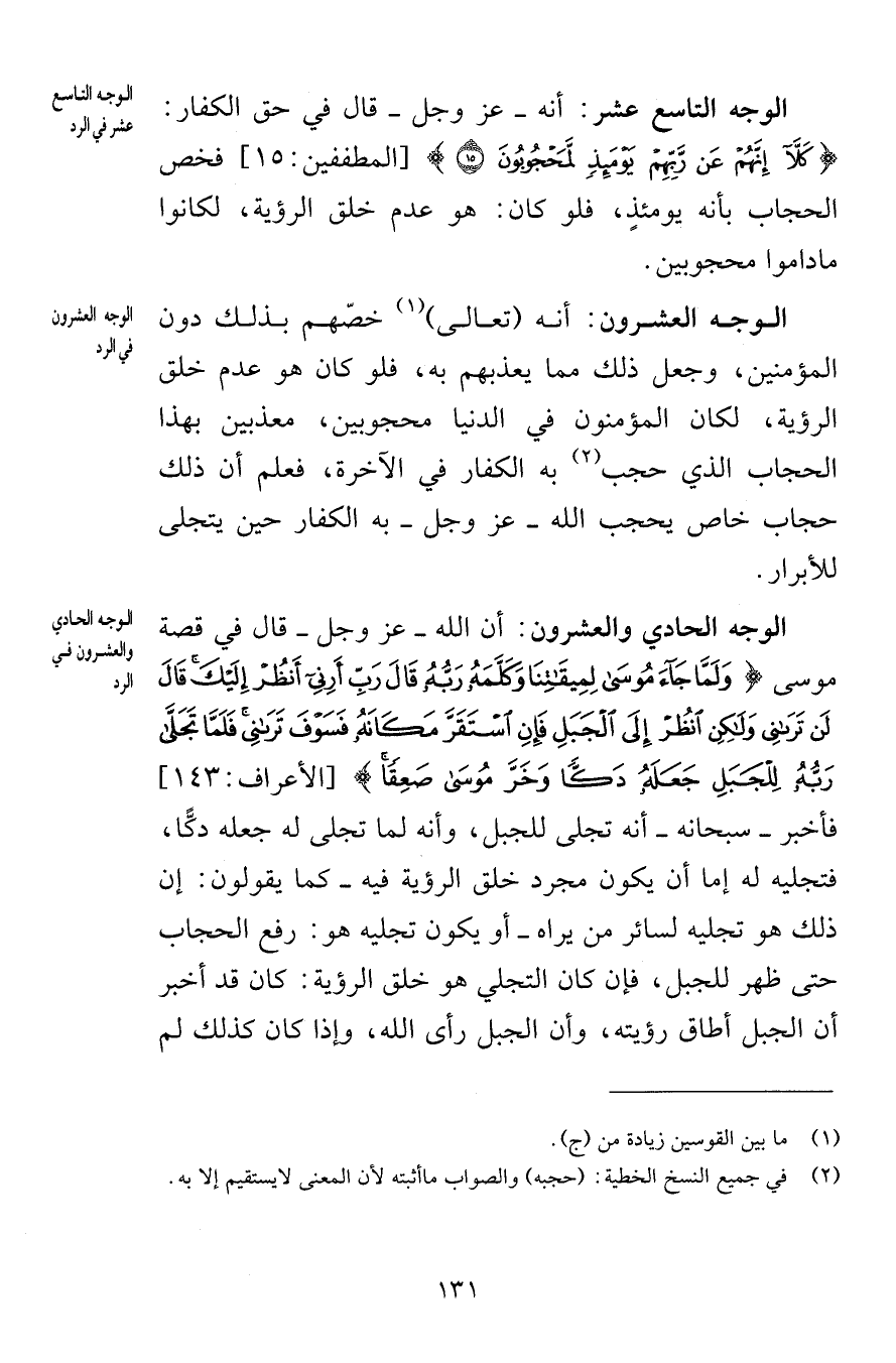 الوجه التاسع عشر أنه عز وجل قال في حق الكفار كَلَّا إِنَّهُمْ عَنْ رَبِّهِمْ يَوْمَئِذٍ لَمَحْجُوبُونَ (15) [المطففين 15] فخص الحجاب بأنه يومئذٍ فلو كان هو عدم خلق الرؤية لكانوا ما داموا محجوبين الوجه العشرون أنه تعالى خصّهم بذلك دون المؤمنين وجعل ذلك مما يعذبهم به فلو كان هو عدم خلق الرؤية لكان المؤمنون في الدنيا محجوبين معذبين بهذا الحجاب الذي حجب به الكفار في الآخرة فعلم أن ذلك حجاب خاص يحجب الله عز وجل به الكفار حين يتجلى للأبرار الوجه الحادي والعشرون أن الله عز وجل قال في قصة موسى وَلَمَّا جَاءَ مُوسَى لِمِيقَاتِنَا وَكَلَّمَهُ رَبُّهُ قَالَ رَبِّ أَرِنِي أَنْظُرْ إِلَيْكَ قَالَ لَنْ تَرَانِي وَلَكِنِ انْظُرْ إِلَى الْجَبَلِ فَإِنِ اسْتَقَرَّ مَكَانَهُ فَسَوْفَ تَرَانِي فَلَمَّا تَجَلَّى رَبُّهُ لِلْجَبَلِ جَعَلَهُ دَكًّا وَخَرَّ مُوسَى صَعِقًا [الأعراف 143] فأخبر سبحانه أنه تجلى للجبل وأنه لما تجلى له جعله دكًّا فتجليه له إما أن يكون مجرد خلق الرؤية فيه كما يقولون إن ذلك هو تجليه لسائر من يراه أو يكون تجليه هو رفع الحجاب حتى ظهر للجبل فإن كان التجلي هو خلق الرؤية كان قد أخبر أن الجبل أطاق رؤيته وأن الجبل رأى الله وإذا كان كذلك لم