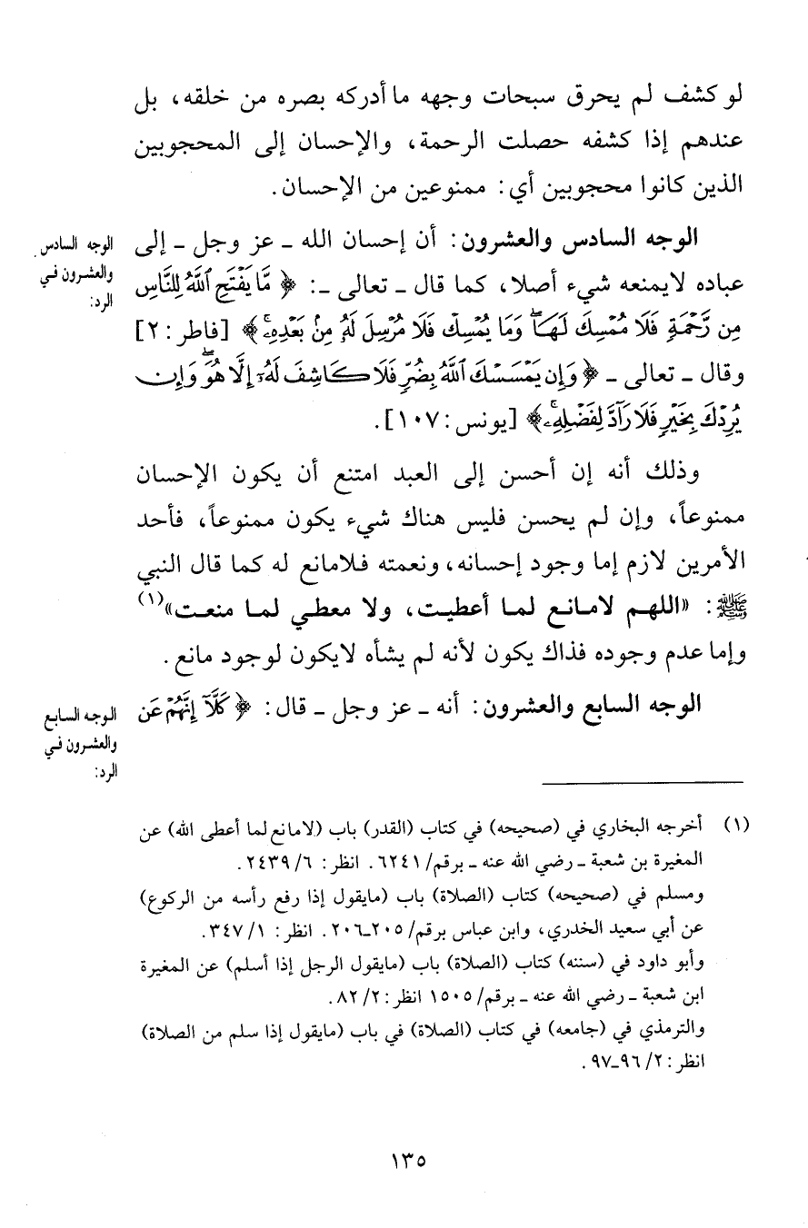 لو كشف لم يحرق سبحات وجهه ما أدركه بصره من خلقه بل عندهم إذا كشفه حصلت الرحمة والإحسان إلى المحجوبين الذين كانوا محجوبين أي ممنوعين من الإحسان الوجه السادس والعشرون أن إحسان الله عز وجل إلى عباده لا يمنعه شيء أصلاً كما قال تعالى مَا يَفْتَحِ اللَّهُ لِلنَّاسِ مِنْ رَحْمَةٍ فَلَا مُمْسِكَ لَهَا وَمَا يُمْسِكْ فَلَا مُرْسِلَ لَهُ مِنْ بَعْدِهِ [فاطر 2] وقال تعالى وَإِنْ يَمْسَسْكَ اللَّهُ بِضُرٍّ فَلَا كَاشِفَ لَهُ إِلَّا هُوَ وَإِنْ يُرِدْكَ بِخَيْرٍ فَلَا رَادَّ لِفَضْلِهِ [يونس 107] وذلك أنه إن أحسن إلى العبد امتنع أن يكون الإحسان ممنوعاً وإن لم يحسن فليس هناك شيء يكون ممنوعاً فأحد الأمرين لازم إما وجود إحسانه ونعمته فلا مانع له كما قال النبي صلى الله عليه وسلم اللهم لا مانع لما أعطيت ولا معطي لما منعت وإما عدم وجوده فذلك يكون لأنه لم يشأه لا يكون لوجود مانع الوجه السابع والعشرون أنه عز وجل قال كَلَّا إِنَّهُمْ عَنْ
