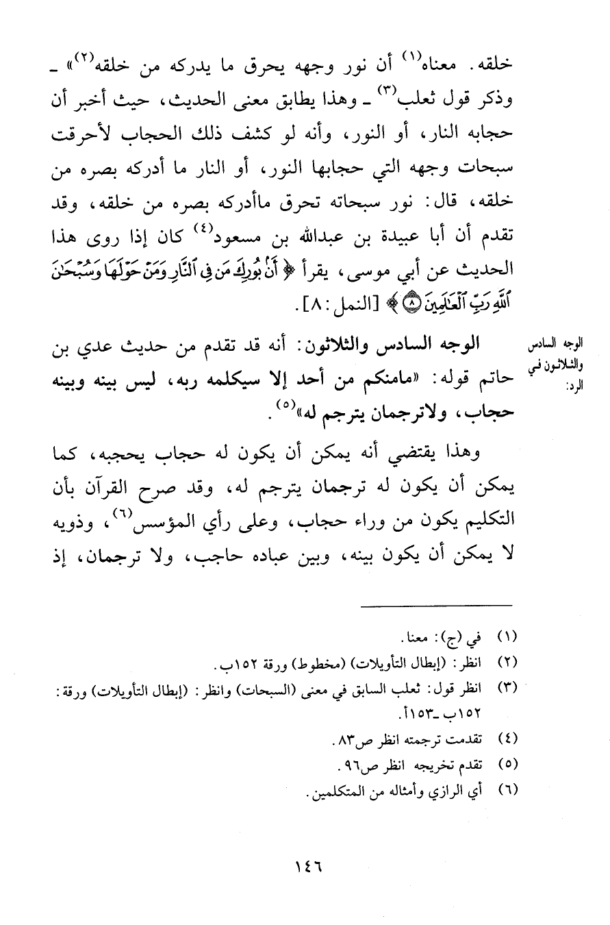 خلقه معناه أن نور وجهه يحرق ما يدركه من خلقه وذكر قول ثعلب وهذا يطابق معنى الحديث حيث أخبر أن حجابه النار أو النور وأنه لو كشف ذلك الحجاب لأحرقت سبحات وجهه الذي حجابها النور أو النار ما أدركه بصره من خلقه قال نور سبحاته تحرق ما أدركه بصره من خلقه وقد تقدم أن أبا عبيدة بن عبد الله بن مسعود كان إذا روى هذا الحديث عن أبي موسى يقرأ أَنْ بُورِكَ مَنْ فِي النَّارِ وَمَنْ حَوْلَهَا وَسُبْحَانَ اللَّهِ رَبِّ الْعَالَمِينَ (8) [النمل 8] الوجه السادس والثلاثون أنه قد تقدم من حديث عدي بن حاتم قوله مامنكم من أحد إلا سيكلمه ربه ليس بينه وبينه حجاب ولا ترجمان يترجم له وهذا يقتضي أنه يمكن أن يكون له حجاب يحجبه كما يمكن أن يكون له ترجمان يترجم له وقد صرح القرآن بأن التكليم يكون من وراء حجاب وعلى رأي المؤسس وذويه لا يمكن أن يكون بينه وبين عباده حاجب ولا ترجمان إذ