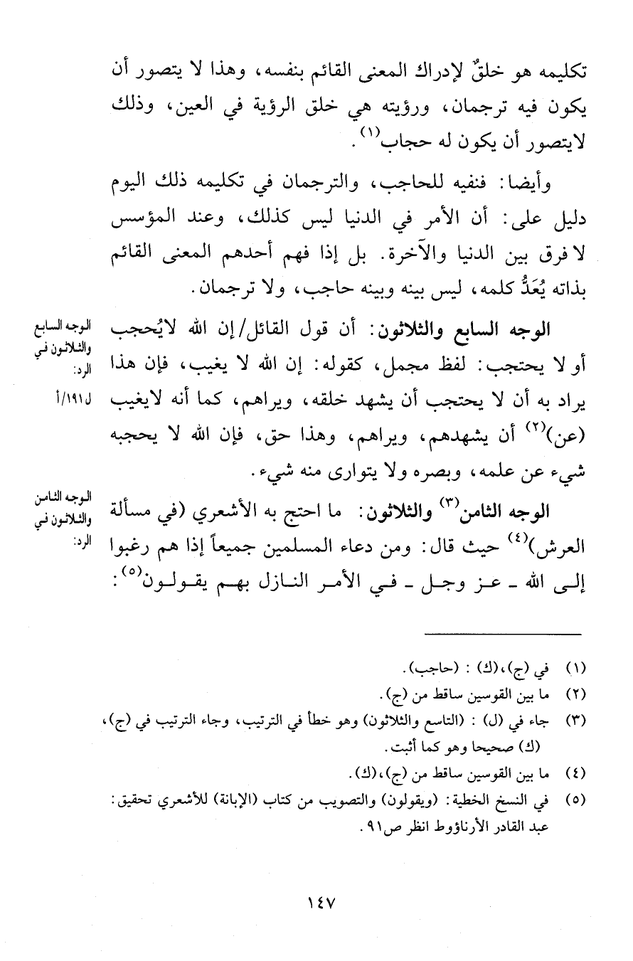 تكليمه هو خلقٌ لإدراك المعنى القائم بنفسه وهذا لا يتصور أن يكون فيه ترجمان ورؤيته هي خلق الرؤية في العين وذلك لا يتصور أن يكون له حجاب وأيضا فنفيه للحاجب والترجمان في تكليمه ذلك اليوم دليل على أن المر في الدنيا ليس كذلك وعند المؤسس لا فرق بين الدنيا والآخرة بل إذا فهم أحدهما المعنى القائم بذاته يُعَدُّ كلمه ليس بينه وبينه حاجب ولا ترجمان الوجه السابع والثلاثون أن قول القائل إن الله لا يُحجب أو لا يحتجب لفظ مجمل كقوله إن الله لا يغيب فإن هذا يراد به أن لا يحتجب أن يشهد خلقه ويراهم كما أنه لا يغيب عن أن يشهدهم ويراهم وهذا حق فإن الله لا يحجبه شيء عن علمه وبصره ولا يتوراى منه شيء الوجه الثامن والثلاثون ما احتج به الأشعري في مسألة العرش حيث قال ومن دعاء المسلمين جميعاً إذا هم رغبوا إلى الله عز وجل في الأمر النازل بهم يقولون