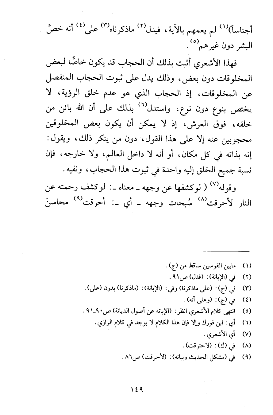 أجناساً لم يعمهم بالآية فيدل ما ذكرناه على أنه خصَّ البشر دون غيرهم فهذا الأشعري أثبت بذلك أن الحجاب قد يكون خاصًّا لبعض المخلوقات دون بعض وذلك يدل على ثبوت الحجاب المنفصل عن المخلوقات إذ الحجاب الذي هو عدم خلق الرؤية لا يختص بنوع دون نوع واستدل بذلك على أن الله بائن من خلقه فوق العرش إذ لا يمكن أن يكون بعض المخلوقين محجوبين عنه إلا على هذا القول دون من ينكر ذلك ويقول إنه بذاته في كل مكان أو أنه لا داخل العالم ولا خارجه فإن نسبة جميع الخلق إليه واحدة في ثبوت هذا الحجاب ونفيه وقوله لو كشفها عن وجهه معناه لو كشف رحمته عن النار لأحرقت سُبحات وجهه أي أحرقت محاسنَ