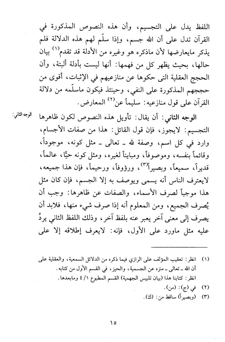اللفظ يدل على التجسيم وأن هذه النصوص المذكورة في القرآن تدل على أن الله جسم وإذا سلّم لهم هذه الدلالة فلم يذكر ما يعارضها لأن ما ذكره هو وغيره من الأدلة قد تقدم بيان حالها بحيث يظهر كل من فهمها أنها ليست بأدلة ألبتة وأن الحجج العقلية التي حكوها عن منازعيهم في الإثبات أقوى من حججهم المذكورة على النفي وحينئذ فيكون ما سلّمه من دلالة القرآن على قول منازعيه سليماً عن المعارض الوجه الثاني أن يقال تأويل هذه النصوص لكون ظاهرها التجسيم لا يجوز فإن قول القائل هذا من صفات الأجسام وارد في كل اسم وصفة لله تعالى مثل كونه موجوداً وقائماً بنفسه وموصوفاً ومبايناً لغيره ومثل كونه حيًّا عالماً قديراً سميعاً وبصيراً ورؤوفاً ورحيماً فإن هذا جميعه لا يعترف الناس انه يسمى ويوصف به إلا الجسم فإن كان مثل هذا موجباً لصرف الأسماء والصفات عن ظاهرها وجب أن يُصرف الجميع ومن المعلوم أنه إذا صرف شيء منها فلابد أن يصرف إلى معنى آخر يعبر عنه بلفظ آخر وذلك اللفظ الثاني يردُ عليه مثل ما ورد على الأول فإنه لا يعرف إطلاقه إلا على