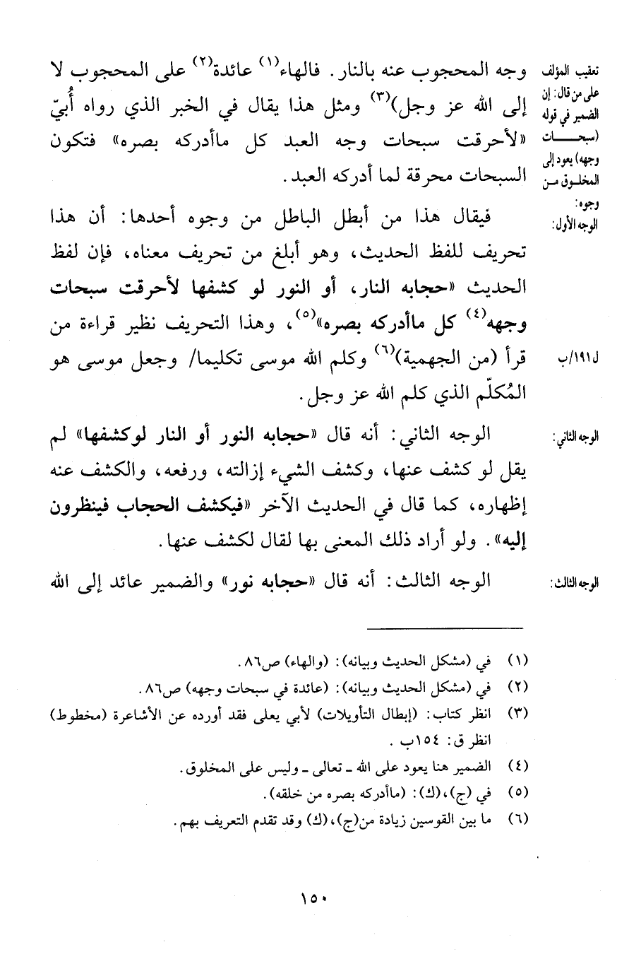 وجه المحجوب عنه بالنار فالهاء عائدة على المحجوب لا إلى الله عز وجل ومثل هذا يقال في الخبر الذي رواه أُبيّ لأحرقت سبحات وجه العبد كل ما أدركه بصره فتكون السبحات محرقة لما أدركه العبد فيقال هذا من أبطل الباطل من وجوه أحدها أن هذا تحريف للفظ الحديث وهو أبلغ من تحريف معناه فإن لفظ الحديث حجابه النار أو النور لو كشفها لأحرقت سبحات وجهه كل ما أدركه بصره وهذا التحريف نظير قراءة من قرأ من الجهمية وكلم الله موسى تكليما وجعل موسى هو المُكلّم الذي كلم الله عز وجل الوجه الثاني أنه قال حجابه النور أو النار لو كشفها لم يقل لو كشف عنها وكشف الشيء إزالته ورفعه والكشف عنه إظهاره كما قال في الحديث الآخر فيكشف الحجاب فينظرون إليه ولو أراد ذلك المعنى بها لقال لكشف عنها الوجه الثالث أنه قال حجابه نور والضمير عائد إلى الله