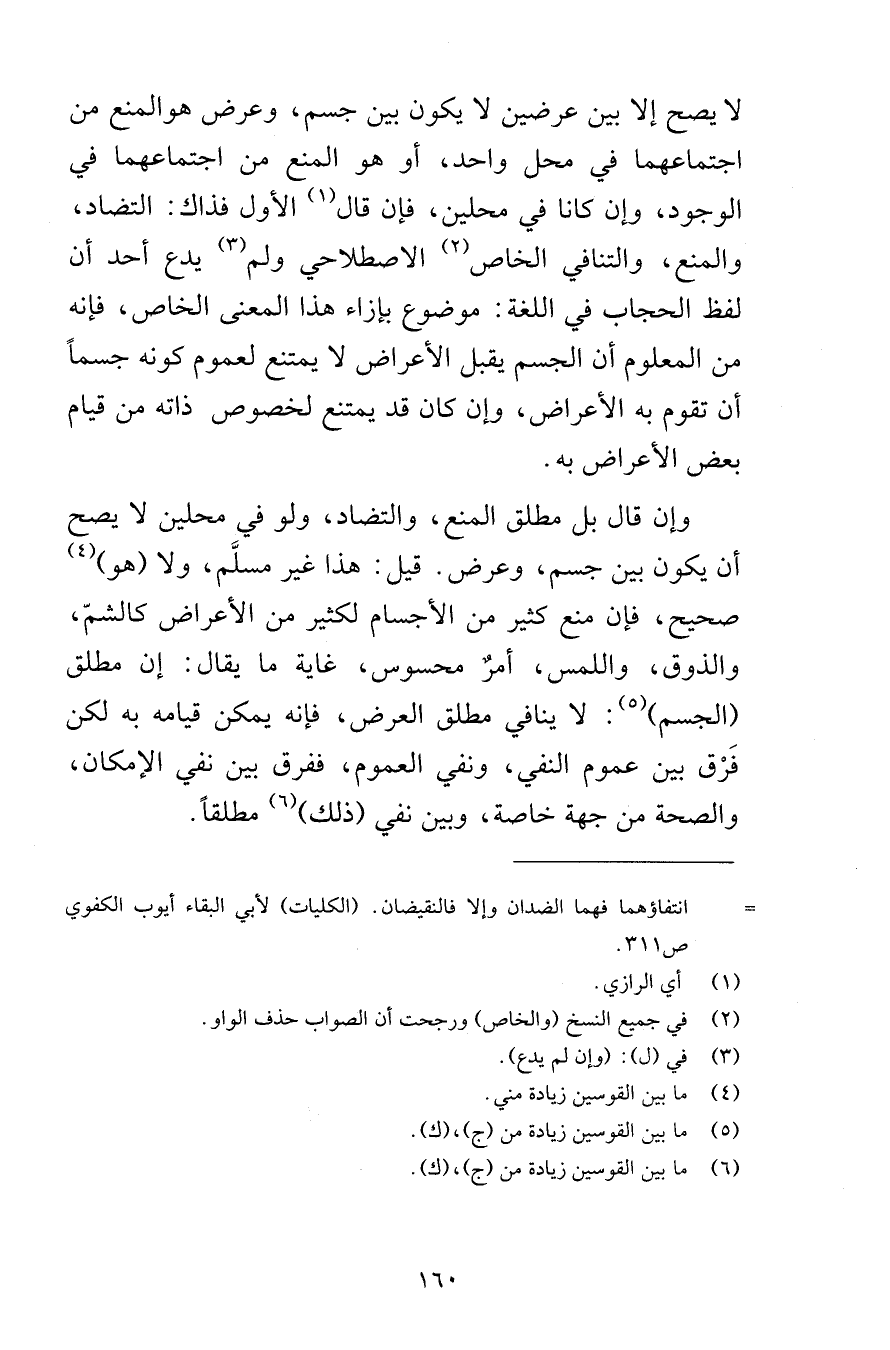 لا يصح إلا بين عرضين لا يكون بين جسم وعرض وهو المنع من اجتماعهما في محل واحد أو هو المنع من اجتماعهما في الوجود وإن كان في محلين فإن قال الأول فذاك التضاد والمنع والتنافي الخاص الاصطلاحي ولم يدع أحد أن لفظ الحجاب في اللغة موضوع بإزاء هذا المعنى الخاص فإنه من المعلوم أن الجسم يقبل الأعراض لا يمتنع لعموم كونه جسماً أن تقوم به الأعراض وإن كان قد يمتنع لخصوص ذاته من قيام بعض الأعراض به وإن قال بل مطلق المنع والتضاد ولو في محلين لا يصح أن يكون بين جسم وعرض قيل هذا غير مسلَّم ولا هو صحيح فإن منع كثير من الأجسام لكثير من الأعراض كالشمّ والذوق واللمس أمرٌ محسوس غاية ما يقال إن مطلق الجسم لا ينافي مطلق العرض فإنه يمكن قيامه به لكن فَرْق بين عموم النفي ونفي العموم ففرق بين نفي الإمكان والصحة من جهة خاصة وبين نفي ذلك مطلقاً