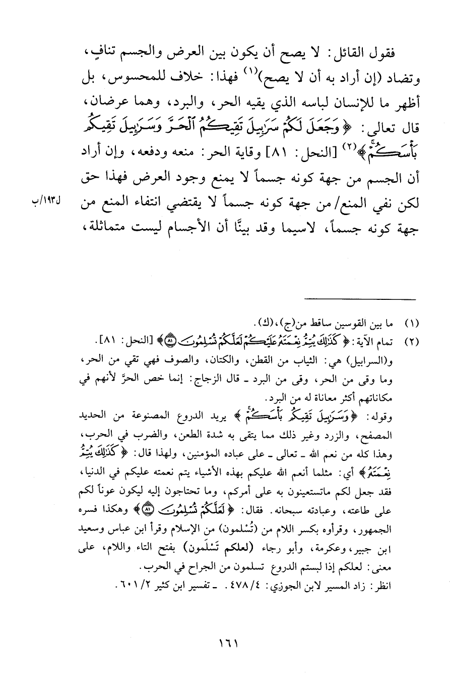 فقول القائل لا يصح أن يكون بين العرض والجسم تنافٍ وتضاد إن أراد به أن لا يصح فهذا خلاف للمحسوس بل أظهر ما للإنسان لباسه الذي يقيه الحر والبرد وهما عرضان قال تعالى وَجَعَلَ لَكُمْ سَرَابِيلَ تَقِيكُمُ الْحَرَّ وَسَرَابِيلَ تَقِيكُمْ بَأْسَكُمْ [النحل 81] وقاية الحر منعه ودفعه وإن أراد أن الجسم من جهة كونه جسماً لا يمنع وجود العرض فهذا حق لكن نفي المنع من جهة كونه جسماً لا يقتضي انتفاء المنع من جهة كونه جسماً لاسيما وقد بينَّا أن الأجسام ليست متماثلة