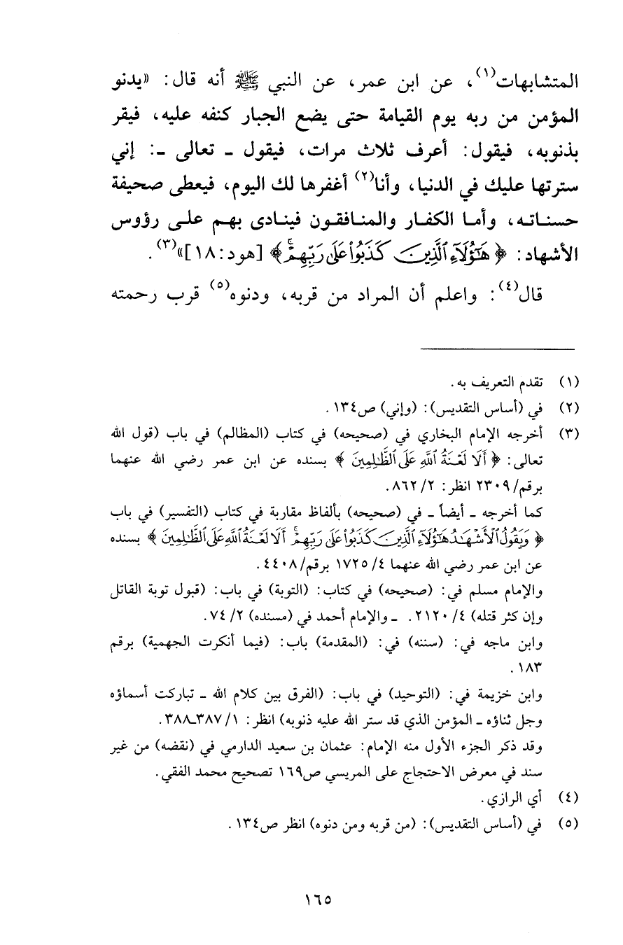 المتشابهات عن ابن عمر عن النبي صلى الله عليه وسلم أنه قال يدنو المؤمن من ربه يوم القيامة حتى يضع الجبار كنفه عليه فيقر بذنوبه فيقول أعرف ثلاث مرات فيقول تعالى إني سترتها عليك في الدنيا وأنا أغفرها لك اليوم فيعطى صحيفة حسناته وأما الكفار والمنافقون فينادى بهم على رؤوس الأشهاد هَؤُلَاءِ الَّذِينَ كَذَبُوا عَلَى رَبِّهِمْ [هود 18] قال واعلم أن المراد من قربه ودنوه قرب رحمته