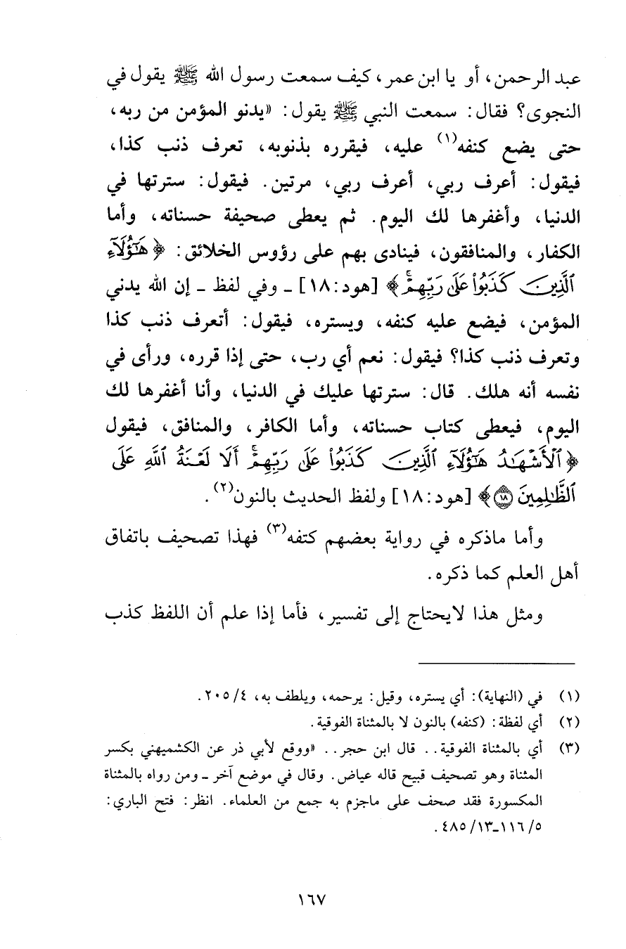 عبد الرحمن أو يا ابن عمر كيف سمعت رسول الله صلى الله عليه وسلم يقول في النجوى فقال سمعت النبي صلى الله عليه وسلم يقول يدنو المؤمن من ربه حتى يضع كنفه عليه فيقرره بذنوبه تعرف ذنب كذا فيقول أعرف ربي أعرف ربي مرتين فيقول سترتها في الدنيا وأغفرها لك اليوم ثم يعطى صحيفة حسناته وأما الكفار والمنافقون فينادى بهم على رؤوس الخلائق هَؤُلَاءِ الَّذِينَ كَذَبُوا عَلَى رَبِّهِمْ [هود 18] وفي لفظ إن الله يدني المؤمن فيضع عليه كنفه ويستره فيقول أتعرف ذنب كذا وتعرف ذنب كذا فيقول نعم أي رب حتى إذا قرره ورأى في نفسه أنه هلك قال سترتها عليك في الدنيا وأنا أغفرها لك اليوم فيعطى كتاب حسناته وأما الكافر والمنافق فيقول الْأَشْهَادُ هَؤُلَاءِ الَّذِينَ كَذَبُوا عَلَى رَبِّهِمْ أَلَا لَعْنَةُ اللَّهِ عَلَى الظَّالِمِينَ (18) [هود 18] ولفظ الحديث بالنون وأما ما ذكره في رواية بعضهم كتفه فهذا تصحيف باتفاق أهل العلم كما ذكره ومثل هذا لا يحتاج إلى تفسير فأما إذا علم أن اللفظ كذب