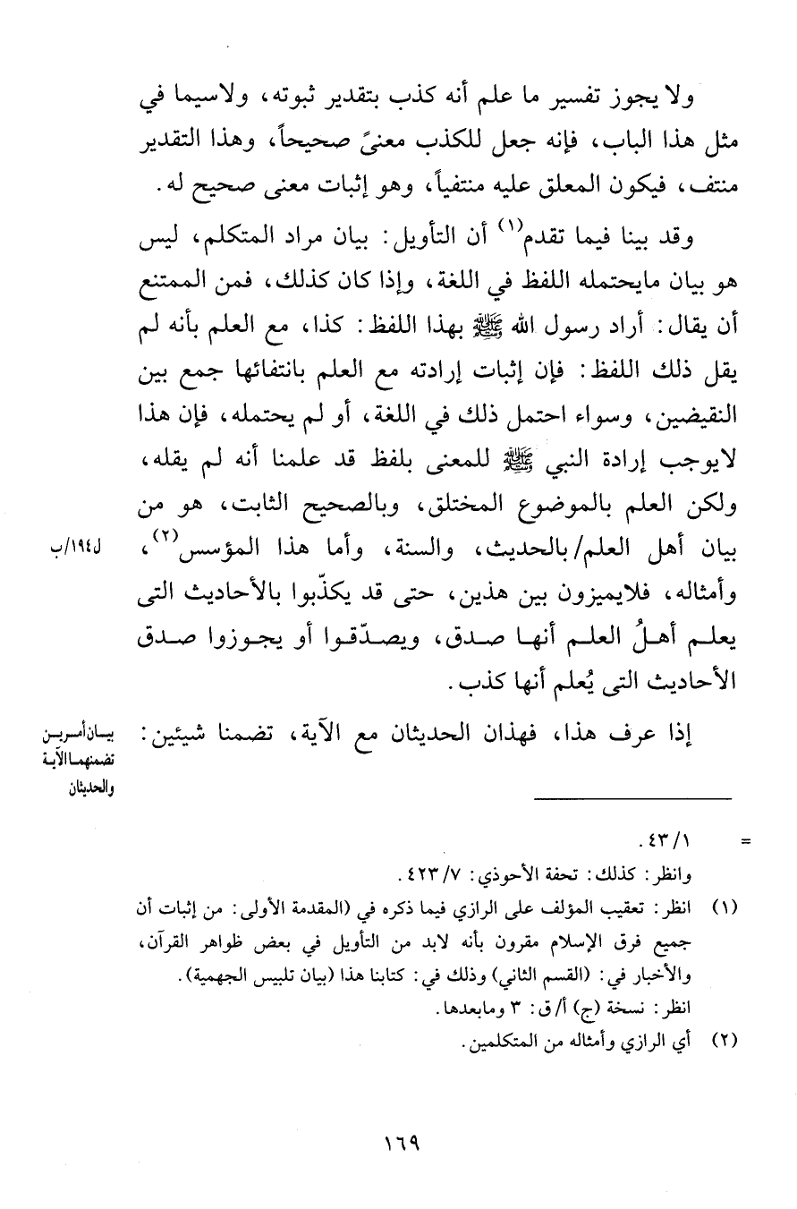 ولا يجوز تفسير ما علم أنه كذب بتقدير ثبوته ولاسيما في مثل هذا الباب فإنه جعل للكذب معنىً صحيحاً وهذا التقدير منتف فيكون المعلق عليه منتفياً وهو إثبات معنى صحيح له وقد بينا فيما تقدم أن التأويل بيان مراد المتكلم ليس هو بيان ما يحتمله اللفظ في اللغة وإذا كان كذلك فمن الممتنع أن يقال أراد رسول الله صلى الله عليه وسلم بهذا اللفظ كذا مع العلم بأنه لم يقل ذلك اللفظ فإن إثبات إرادته مع العلم بانتفائها جمع بين النقيضين وسواء احتمل ذلك في اللغة أو لم يحتمله فإن هذا لا يوجب إرادة النبي صلى الله عليه وسلم للمعنى بلفظ قد علمنا أنه لم يقله ولكن العلم بالموضوع المختلق وبالصحيح الثابت هو من بيان أهل العلم بالحديث والسنة وأما هذا المؤسس وأمثاله فلا يميزون بين هذين حتى قد يكذّبوا بالأحاديث التي يعلم أهلُ العلم أنها صدق ويصدّقوا أو يجوزوا صدق الأحاديث التي يُعلم أنها كذب إذا عرف هذا فهذان الحديثان مع الآية تضمنا شيئين