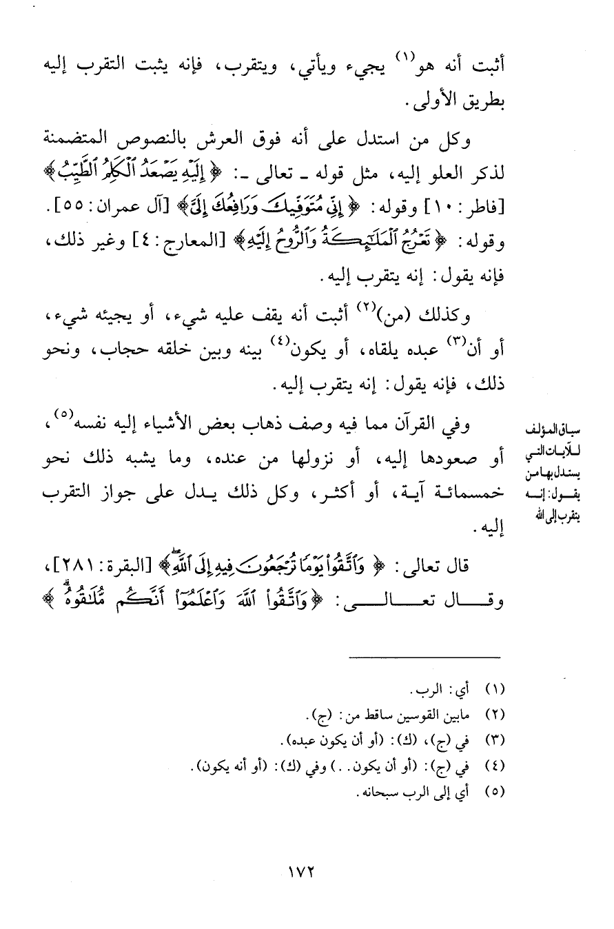 أثبت أنه هو يجيء ويأتي ويتقرب فإنه يثبت التقرب إليه بطريق الأولى وكل من استدل على أنه فوق العرش بالنصوص المتضمنة لذكر العلو إليه مثل قوله تعالى إِلَيْهِ يَصْعَدُ الْكَلِمُ الطَّيِّبُ [فاطر 10] وقوله إِنِّي مُتَوَفِّيكَ وَرَافِعُكَ إِلَيَّ [آل عمران 55] وقوله تَعْرُجُ الْمَلَائِكَةُ وَالرُّوحُ إِلَيْهِ [المعارج 4] وغير ذلك فإنه يقول إنه يتقرب إليه وكذلك من أثبت أنه يقف عليه شيء أو يجيئه شيء أو أن عبده يلقاه أو يكون بينه وبين خلقه حجاب ونحو ذلك فإنه يقول إنه يتقرب إليه وفي القرآن مما فيه وصف ذهاب بعض الأشياء إليه نفسه أو صعودها إليه أو نزولها من عنده وما يشبه ذلك نحو خمسمائة آية أو أكثر وكل ذلك يدل على جواز التقرب إليه قال تعالى وَاتَّقُوا يَوْمًا تُرْجَعُونَ فِيهِ إِلَى اللَّهِ [البقرة 281] وقال تعالى وَاتَّقُوا اللَّهَ وَاعْلَمُوا أَنَّكُمْ مُلَاقُوهُ