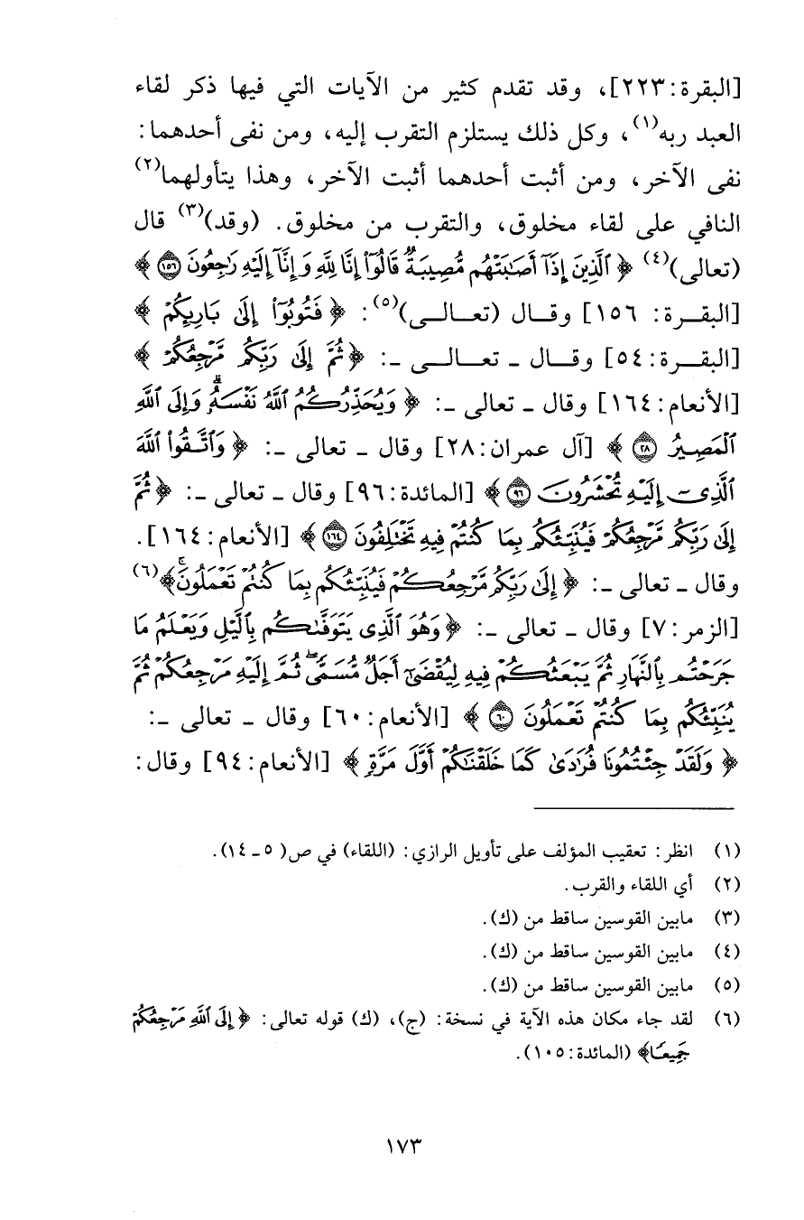 [البقرة 223] وقد تقدم كثير من الآيات التي فيها ذكر لقاء العبد ربه وكل ذلك يستلزم التقرب إليه ومن نفى أحدهما نفى الآخر ومن أثبت أحدهما أثبت الآخر وهذا يتأولهما النافي على لقاء مخلوق التقرب من مخلوق وقد قال تعالى الَّذِينَ إِذَا أَصَابَتْهُمْ مُصِيبَةٌ قَالُوا إِنَّا لِلَّهِ وَإِنَّا إِلَيْهِ رَاجِعُونَ (156) [البقرة 156] وقال تعالى فَتُوبُوا إِلَى بَارِئِكُمْ [البقرة 54] وقال تعالى ثُمَّ إِلَى رَبِّكُمْ مَرْجِعُكُمْ [الأنعام 164] وقال تعالى وَيُحَذِّرُكُمُ اللَّهُ نَفْسَهُ وَإِلَى اللَّهِ الْمَصِيرُ (28) [آل عمران 28] وقال تعالى وَاتَّقُوا اللَّهَ الَّذِي إِلَيْهِ تُحْشَرُونَ (96) [المائدة 96] وقال تعالى ثُمَّ إِلَى رَبِّكُمْ مَرْجِعُكُمْ فَيُنَبِّئُكُمْ بِمَا كُنْتُمْ فِيهِ تَخْتَلِفُونَ (164) [الأنعام 164] وقال تعالى إِلَى رَبِّكُمْ مَرْجِعُكُمْ فَيُنَبِّئُكُمْ بِمَا كُنْتُمْ تَعْمَلُونَ [الزمر 7] وقال تعالى وَهُوَ الَّذِي يَتَوَفَّاكُمْ بِاللَّيْلِ وَيَعْلَمُ مَا جَرَحْتُمْ بِالنَّهَارِ ثُمَّ يَبْعَثُكُمْ فِيهِ لِيُقْضَى أَجَلٌ مُسَمًّى ثُمَّ إِلَيْهِ مَرْجِعُكُمْ ثُمَّ يُنَبِّئُكُمْ بِمَا كُنْتُمْ تَعْمَلُونَ (60) [الأنعام 60] وقال تعالى وَلَقَدْ جِئْتُمُونَا فُرَادَى كَمَا خَلَقْنَاكُمْ أَوَّلَ مَرَّةٍ [الأنعام 94] وقال