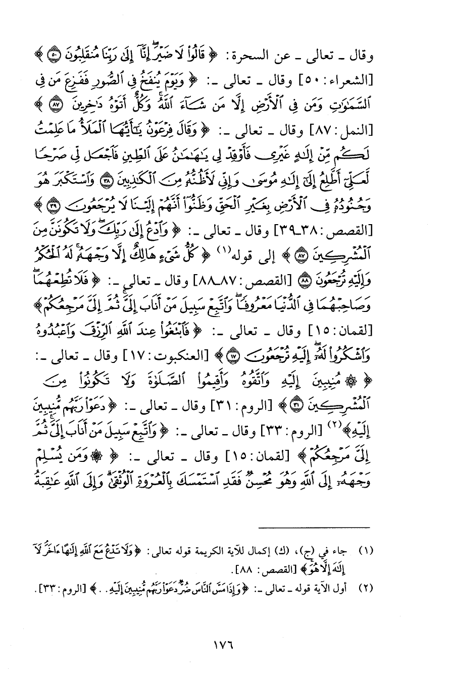 وقال تعالى عن السحرة قَالُوا لَا ضَيْرَ إِنَّا إِلَى رَبِّنَا مُنْقَلِبُونَ (50) [الشعراء 50] وقال تعالى وَيَوْمَ يُنْفَخُ فِي الصُّورِ فَفَزِعَ مَنْ فِي السَّمَاوَاتِ وَمَنْ فِي الْأَرْضِ إِلَّا مَنْ شَاءَ اللَّهُ وَكُلٌّ أَتَوْهُ دَاخِرِينَ (87) [النمل 87] وقال تعالى وَقَالَ فِرْعَوْنُ يَا أَيُّهَا الْمَلَأُ مَا عَلِمْتُ لَكُمْ مِنْ إِلَهٍ غَيْرِي فَأَوْقِدْ لِي يَا هَامَانُ عَلَى الطِّينِ فَاجْعَلْ لِي صَرْحًا لَعَلِّي أَطَّلِعُ إِلَى إِلَهِ مُوسَى وَإِنِّي لَأَظُنُّهُ مِنَ الْكَاذِبِينَ (38) وَاسْتَكْبَرَ هُوَ وَجُنُودُهُ فِي الْأَرْضِ بِغَيْرِ الْحَقِّ وَظَنُّوا أَنَّهُمْ إِلَيْنَا لَا يُرْجَعُونَ (39) [القصص 38-39] وقال تعالى وَادْعُ إِلَى رَبِّكَ وَلَا تَكُونَنَّ مِنَ الْمُشْرِكِينَ (87) إلى قوله كُلُّ شَيْءٍ هَالِكٌ إِلَّا وَجْهَهُ لَهُ الْحُكْمُ وَإِلَيْهِ تُرْجَعُونَ (88) [القصص 87-88] وقال تعالى فَلَا تُطِعْهُمَا وَصَاحِبْهُمَا فِي الدُّنْيَا مَعْرُوفًا وَاتَّبِعْ سَبِيلَ مَنْ أَنَابَ إِلَيَّ ثُمَّ إِلَيَّ مَرْجِعُكُمْ [لقمان 15] وقال تعالى فَابْتَغُوا عِنْدَ اللَّهِ الرِّزْقَ وَاعْبُدُوهُ وَاشْكُرُوا لَهُ إِلَيْهِ تُرْجَعُونَ (17) [العنكبوت 17] وقال تعالى مُنِيبِينَ إِلَيْهِ وَاتَّقُوهُ وَأَقِيمُوا الصَّلَاةَ وَلَا تَكُونُوا مِنَ الْمُشْرِكِينَ (31) [الروم 31] وقال تعالى دَعَوْا رَبَّهُمْ مُنِيبِينَ إِلَيْهِ [الروم 33] وقال تعالى وَاتَّبِعْ سَبِيلَ مَنْ أَنَابَ إِلَيَّ ثُمَّ إِلَيَّ مَرْجِعُكُمْ [لقمان 15] وقال تعالى وَمَنْ يُسْلِمْ وَجْهَهُ إِلَى اللَّهِ وَهُوَ مُحْسِنٌ فَقَدِ اسْتَمْسَكَ بِالْعُرْوَةِ الْوُثْقَى وَإِلَى اللَّهِ عَاقِبَةُ