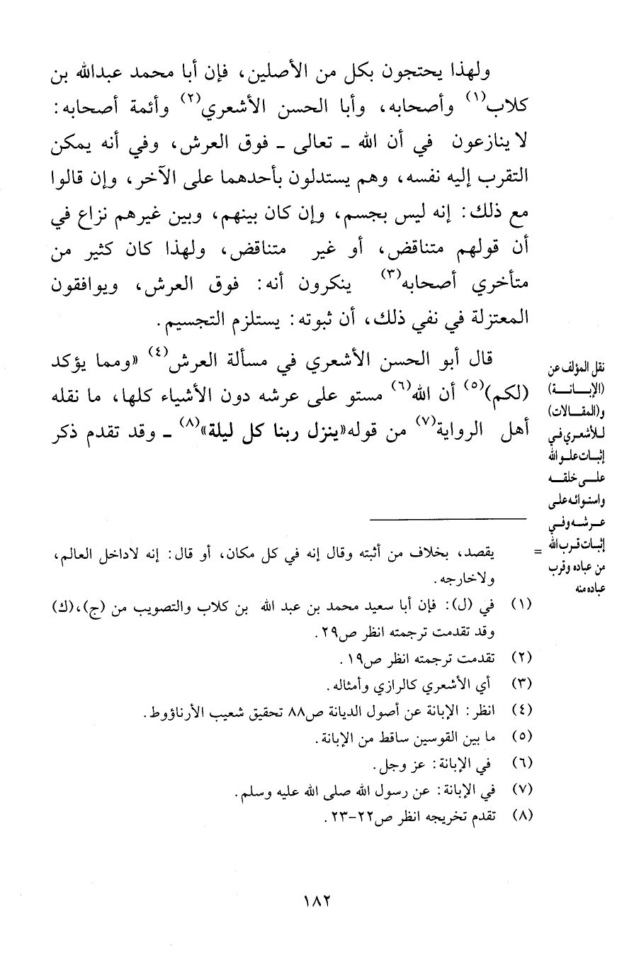 ولهذا يحتجون بكل من الأصلين فإن أبا محمد عبد الله بن كلاب وأصحابه وأبا الحسن الأشعري وأئمة أصحابه لا ينازعون في أن الله تعالى فوق العرش وفي أنه يمكن التقرب إليه نفسه وهم يستدلون بأحدهما على الآخر وإن قالوا مع ذلك إنه ليس بجسم وإن كان بينهم وبين غيرهم نزاع في أن قولهم متناقض أو غير متناقض ولهذا كان كثير من متأخري أصحابه ينكرون أنه فوق العرش ويوافقون المعتزلة في نفي ذلك أن ثبوته يستلزم التجسيم قال أبو الحسن الأشعري في مسألة العرش ومما يؤكد لكم أن الله مستو على عرشه دون الأشياء كلها ما نقله أهل الرواية من قوله ينزل ربنا كل ليلة وقد تقدم ذكر