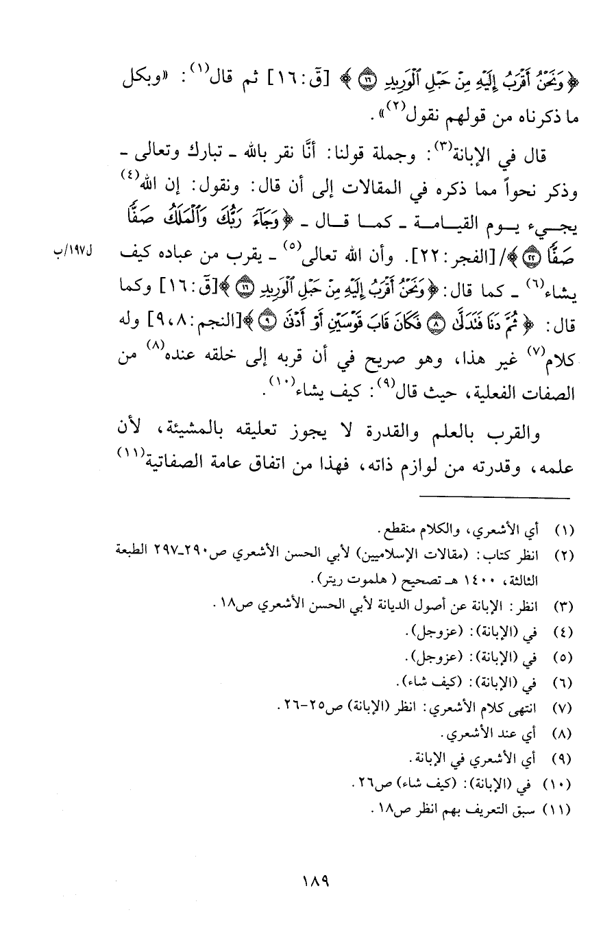 وَنَحْنُ أَقْرَبُ إِلَيْهِ مِنْ حَبْلِ الْوَرِيدِ (16) [ق 16] ثم قال وبكل ما ذكرناه من قولهم نقول قال في الإبانة وجملة قولنا أنَّا نقر بالله تبارك وتعالى وذكر نحواً مما ذكره في المقالات إلى أن قال ونقول إن الله يجيء يوم القيامة كما قال وَجَاءَ رَبُّكَ وَالْمَلَكُ صَفًّا صَفًّا (22) [الفجر 22] وأن الله تعالى يقرب من عباده كيف يشاء كما قال وَنَحْنُ أَقْرَبُ إِلَيْهِ مِنْ حَبْلِ الْوَرِيدِ (16) [ق 16] وكما قال ثُمَّ دَنَا فَتَدَلَّى (8) فَكَانَ قَابَ قَوْسَيْنِ أَوْ أَدْنَى (9) [النجم 8-9] وله كلام غير هذا وهو صريح في أن قربه إلى خلقه عنده من الصفات الفعلية حيث قال كيف يشاء والقرب بالعلم والقدرة لا يجوز تعليقه بالمشيئة لأن علمه وقدرته من لوازم ذاته فهذا من اتفاق عامة الصفاتية
