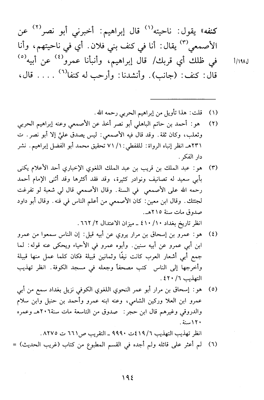 كنفه يقول ناحيته قال إبراهيم أخبرني أبو نصر عن الأصمعي يقال أنا في كنف بني فلان أي في ناحيتهم وأنا في ظلك أي قربك قال إبراهيم وأنبأنا عمرو عن أبيه قال كنف جانب وأنشدنا وأرحب له كنفا قال