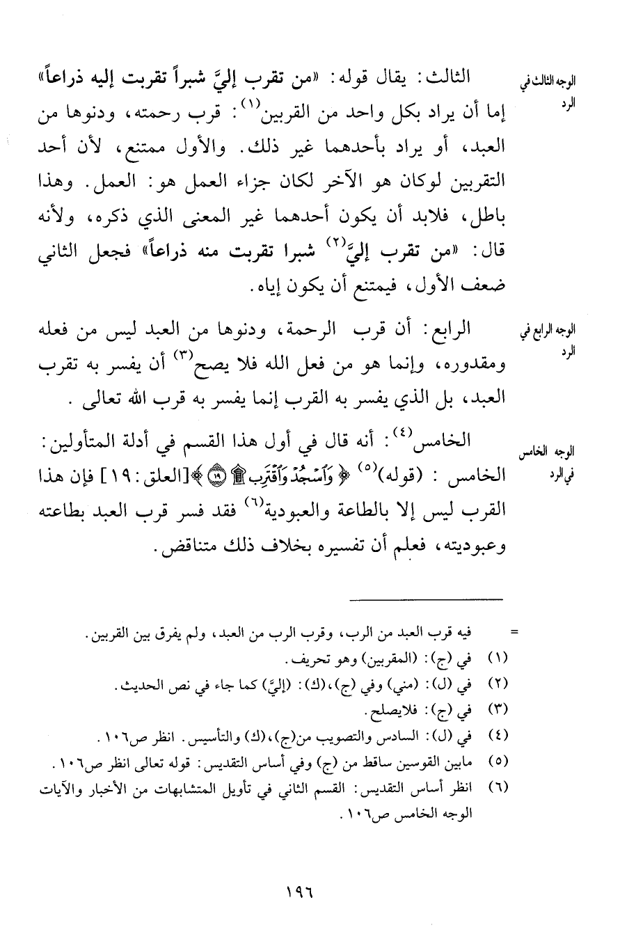 الثالث يقال قوله من تقرب إليَّ شبراً تقربت إليه ذراعاً إما أن يراد بكل واحد من القربين قرب رحمته ودنوها من العبد أو يراد بأحدهما غير ذلك والأول ممتنع لأن أحد التقربين لو كان هو الآخر لكان جزاء العمل هو العمل وهذا باطل فلابد أن يكون أحدهما غير المعنى الذي ذكره ولأنه قال من تقرب إليَّ شبرا تقربت منه ذراعاً فجعل الثاني ضعف الأول فيمتنع أن يكون إياه الرابع أن قرب الرحمة ودنوها من العبد ليس من فعله ومقدوره وإنما هو من فعل الله فلا يصح أن يفسر به تقرب العبد بل الذي يفسر به القرب إنما يفسر به قرب الله تعالى الخامس أنه قال في أول هذا القسم في أدلة المتأولين الخامس قوله وَاسْجُدْ وَاقْتَرِبْ (19) [العلق 19] فإن هذا القرب ليس إلا بالطاعة والعبودية فقد فسر قرب العبد بطاعته وعبوديته فعلم أن تفسيره بخلاف ذلك متناقض