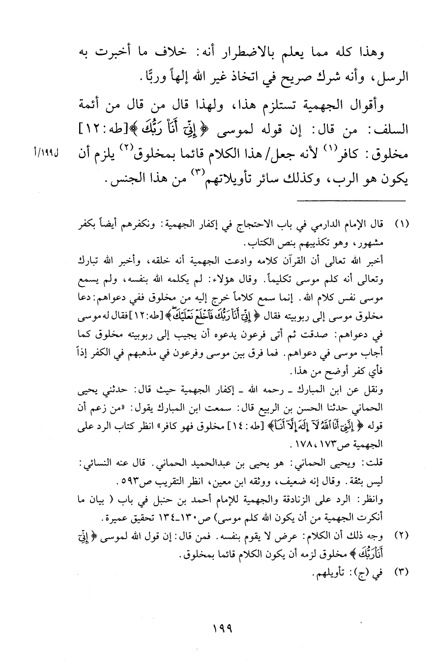 وهذا كله مما يعلم بالاضطرار أنه خلاف ما أخبرت به الرسل وأنه شرك صريح في اتخاذ غير الله إلهاً وربًّا وأقوال الجهمية تستلزم هذا ولهذا قال من قال من أئمة السلف من قال إن قوله لموسى إِنِّي أَنَا رَبُّكَ [طه 12] مخلوق كافر لأنه جعل هذا الكلام قائما بمخلوق يلزم أن يكون هو الرب وكذلك سائر تأويلاتهم من هذا الجنس