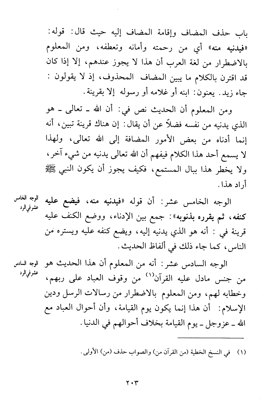 باب حذف المضاف وإقامة المضاف إليه حيث قال قوله فيدنيه منه أي من رحمته وأمانه وتعطفه ومن المعلوم بالاضطرار من لغة العرب أن هذا لا يجوز عندهم إلا إذا كان قد اقترن بالكلام ما يبين المضاف والمحذوف إذ لا يقولون جاء زيد يعنون ابنه أو غلامه أو رسوله إلا بقرينة ومن المعلوم أن الحديث نص في أن الله تعالى هو الذي يدنيه من نفسه فضلاً عن أن يقال إن هناك قرينة تبين أنه إنما أدناه ن بعض الأمور المضافة إلى الله تعالى ولهذا لا يسمع أحد هذا الكلام فيفهم أن الله تعالى يدنيه من شيء آخر ولا يخطر هذا ببال المستمع فكيف يجوز أن يكون النبي صلى الله عليه وسلم أراد هذا الوجه الخامس عشر أن قوله فيدنيه منه فيضع عليه كنفه ثم يقرره بذنوبه جمع بين الإدناء ووضع الكنف عليه قرينة في أنه هو الذي يدنيه إليه ويضع كنفه عليه ويستره من الناس كما جاء ذلك في ألفاظ الحديث الوجه السادس عشر أنه من المعلوم أن هذا الحديث هو من جنس مادل عليه القرآن من وقوف العباد على ربهم وخطابه لهم ومن المعلوم بالاضطرار من رسالات الرسل ودين الإسلام أن هذا إنما يكون يوم القيامة وأن أحوال العباد مع الله عز وجل يوم القيامة بخلاف أحوالهم في الدنيا