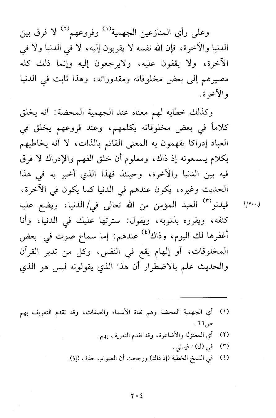 وعلى رأي المنازعين الجهمية وفروعهم لا فرق بين الدنيا والآخرة فإن اله نفسه لا يقربون إليه لا في الدنيا ولا في الآخرة ولا يقفون عليه ولا يرجعون إليه وإنما ذلك كلهم مصيرهم إلى بعض مخلوقاته ومقدوراته وهذا ثابت في الدنيا والآخرة وكذلك خطابهم لهم معناه عند الجهمية المحضة أنه يخلق كلاماً في بعض مخلوقاته يكلمهم وعند فروعهم يخلق في العباد إدراكاً يفهمون به المعنى القائم بالذات لا أنه يخاطبهم بكلام يسمعونه إذ ذاك ومعلوم أن خلق الفهم والإدراك لا فرق فيه بين الدنيا والآخرة وحينئذ فهذا الذي أخبر به في هذا الحديث وغيره يكون عندهم في الدنيا كما يكون في الآخرة فيدنو العبد المؤمن من الله تعالى في الدنيا ويضع عليه كنفه ويقرره بذنوبه ويقول سترتها عليك في الدنيا وأنا أغفرها لك اليوم وذاك عندهم إما سماع صوت في بعض المخلوقات أو إلهام يقع في النفس وكل من تدبر القرآن والحديث علم بالاضطرار أن هذا الذي يقولونه ليس هو الذي