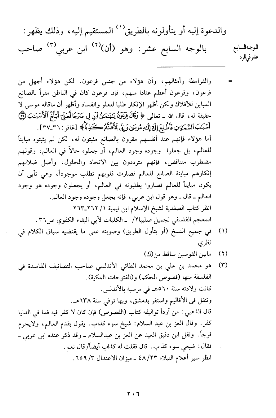 والدعوة إليه أو يتأولونه بالطريق المستقيم إليه وذلك يظهر بالوجه السابع عشر وهو أن ابن عربي صاحب