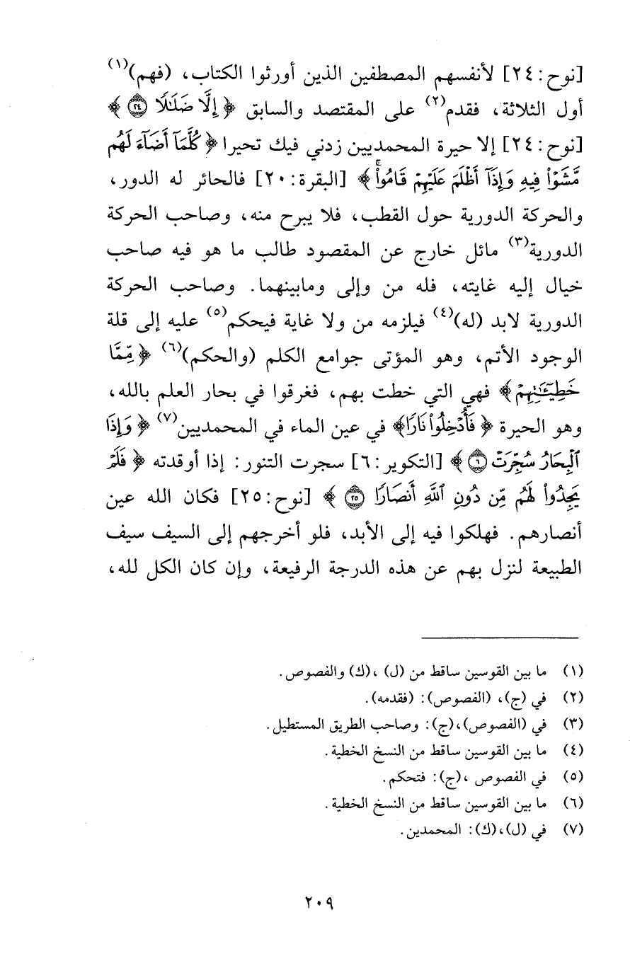 [نوح 24] لأنفسهم المصطفين الذين أورثوا الكتاب فهم أول الثلاثة فقدم على المقتصد والسابق إِلَّا ضَلَالًا (24) [نوح 24] إلا حيرة المحمديين زدني فيك تحيرا كُلَّمَا أَضَاءَ لَهُمْ مَشَوْا فِيهِ وَإِذَا أَظْلَمَ عَلَيْهِمْ قَامُوا [البقرة 20] فالحائر له الدور والحركة الدورية حول القطب فلا يبرح منه وصاحب الحركة الدورية لابد له فيلزمه من ولا غاية فيحكم عليه إلى قلة الوجود الأتم وهو المؤتى وجوامع الكلم والحكم مِمَّا خَطِيئَاتِهِمْ فهي التي خطت بهم فغرقوا في بحار العلم بالله وهو الحيرة فَأُدْخِلُوا نَارًا في عين الماء في المحمديين وَإِذَا الْبِحَارُ سُجِّرَتْ (6) [التكوير 6] سجرت التنور إذا أوقدته فَلَمْ يَجِدُوا لَهُمْ مِنْ دُونِ اللَّهِ أَنْصَارًا (25) [نوح 25] فكان الله عين أنصارهم فهلكوا فيه إلى الأبد فلو أخرجهم إلى السيف سيف الطبيعة لنزل بهم عن هذه الدرجة الرفيعة وإن كان الكل لله