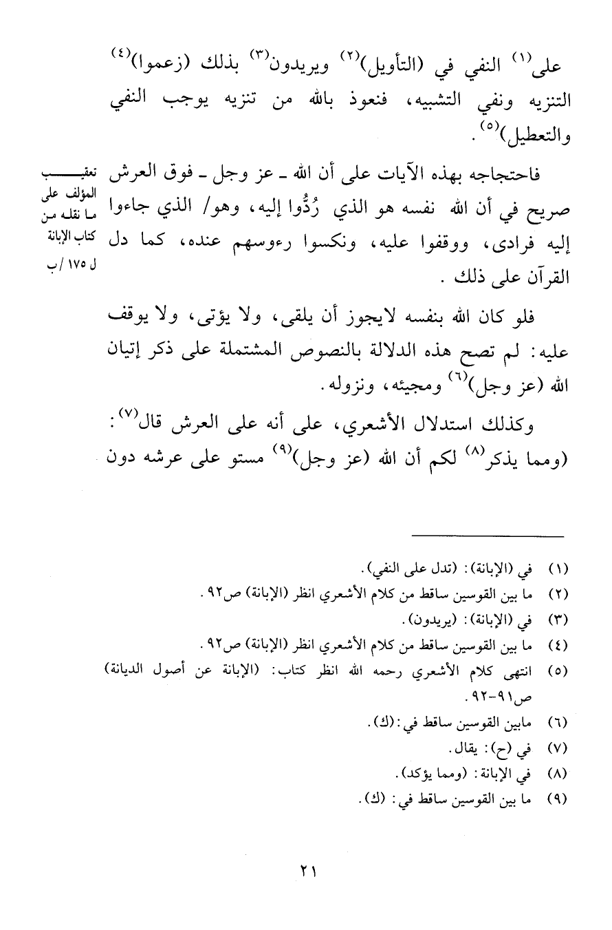 على النفي في التأويل ويريدون بذلك زعموا التنزيه ونفي التشبيه فنعوذ بالله من تنزيه يوجب النفي والتعطيل فاحتجاجه بهذه الآيات على أن الله عز وجل فوق العرش صريح في أن الله نفسه هو الذي رُدُّوا إليه وهو الذي جاءوا إليه فرادى ووقفوا عليه ونكسوا رءوسهم عنده كما دل القرآن على ذلك فلو كان الله بنفسه لا يجوز أن يلقى ولا يؤتى ولا يوقف عليه لم تصح هذه الدلالة بالنصوص المشتملة على ذكر إتيان الله عز وجل ومجيئه ونزوله وكذلك استدلال الأشعري على أنه على العرش قال ومما يذكر لكم أن الله عز وجل مستو على عرشه دون