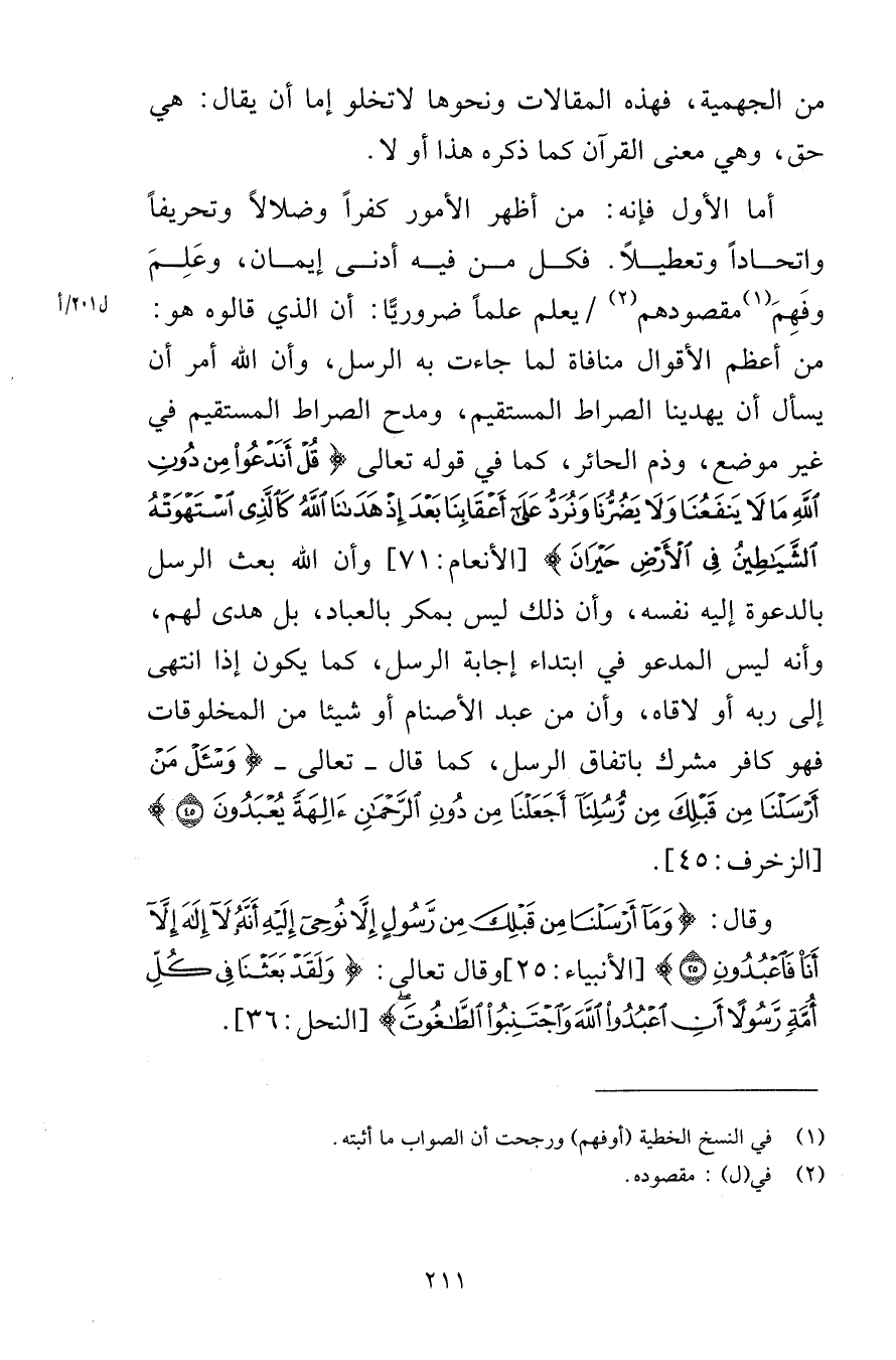 من الجهمية فهذه المقالات ونحوها لا تخلو إما أن يقال هي حق وهي معنى القرآن كما ذكره هذا أو لا أما الأول فإنه من أظهر الأمور كفراً وضلالاً وتحريفاً واتحاداً وتعطيلاً فكل من فيه أدنى إيمان وعَلِمَ وفَهِمَ مقصودهم يعلم علماً ضروريًّا أن الذي قالوه هو من أعظم الأقوال منافاة لما جاءت به الرسل وان الله أمر أن يسأل أن يهدينا الصراط المستقيم ومدح الصراط المستقيم في غير موضع وذم الحائر كما في قوله تعالى قُلْ أَنَدْعُو مِنْ دُونِ اللَّهِ مَا لَا يَنْفَعُنَا وَلَا يَضُرُّنَا وَنُرَدُّ عَلَى أَعْقَابِنَا بَعْدَ إِذْ هَدَانَا اللَّهُ كَالَّذِي اسْتَهْوَتْهُ الشَّيَاطِينُ فِي الْأَرْضِ حَيْرَانَ [الأنعام 71] وأن الله بعث الرسل بالدعوة إليه نفسه وأن ذلك ليس بمكر بالعباد بل هدى لهم وأنه ليس المدعو في ابتداء إجابة الرسل كما يكون إذا انتهى إلى ربه أو لاقاه وأن من عبد الأصنام أو شيئا م المخلوقات فهو كافر مشرك باتفاق الرسل كما قال تعالى وَاسْأَلْ مَنْ أَرْسَلْنَا مِنْ قَبْلِكَ مِنْ رُسُلِنَا أَجَعَلْنَا مِنْ دُونِ الرَّحْمَنِ آلِهَةً يُعْبَدُونَ (45) [الزخرف 45] وقال وَمَا أَرْسَلْنَا مِنْ قَبْلِكَ مِنْ رَسُولٍ إِلَّا نُوحِي إِلَيْهِ أَنَّهُ لَا إِلَهَ إِلَّا أَنَا فَاعْبُدُونِ (25) [الأنبياء 25] وقال تعالى وَلَقَدْ بَعَثْنَا فِي كُلِّ أُمَّةٍ رَسُولًا أَنِ اعْبُدُوا اللَّهَ وَاجْتَنِبُوا الطَّاغُوتَ [النحل 36]