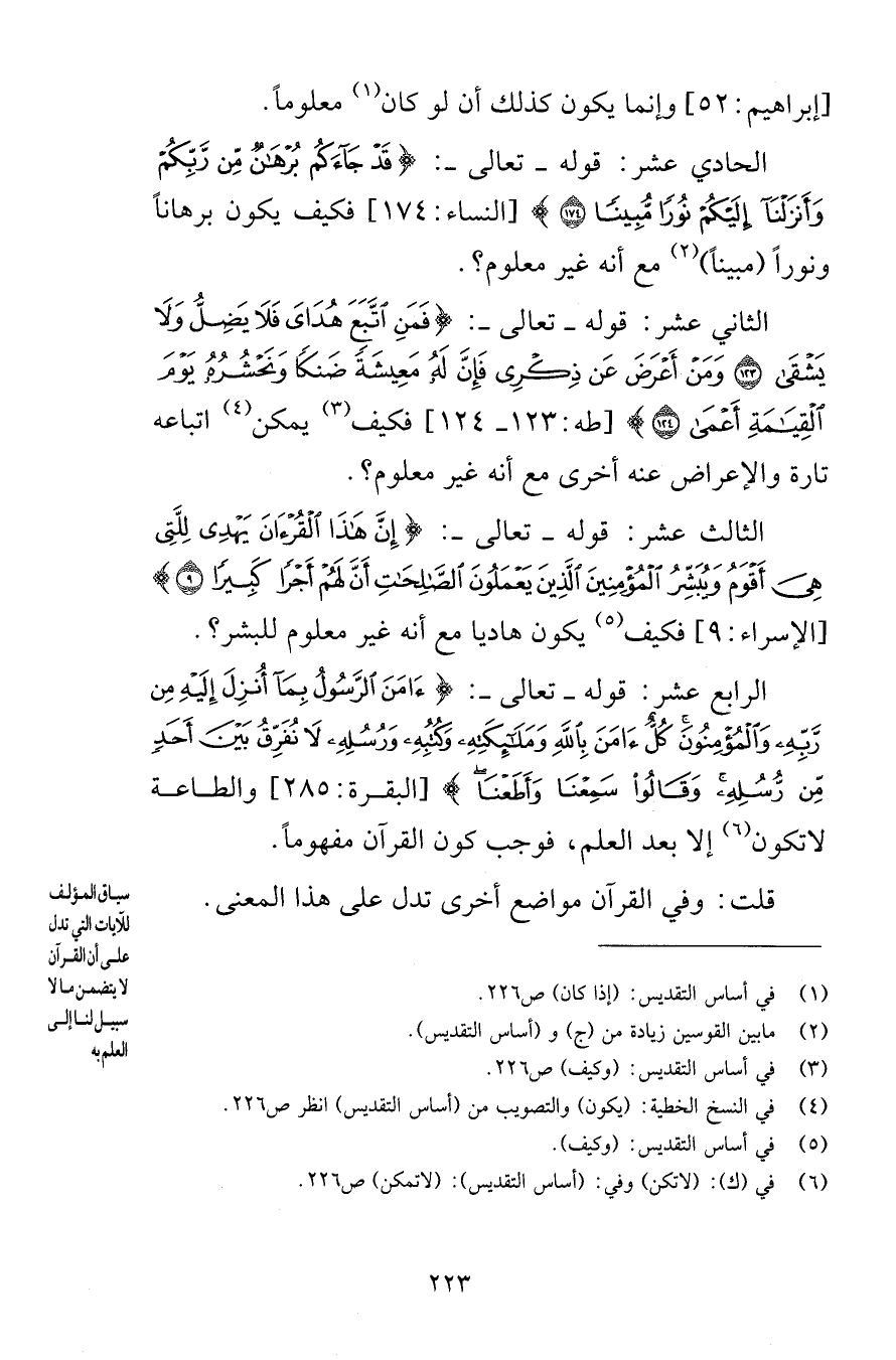 [إبراهيم 52] وإنما يكون كذلك أن لو كان معلوماً الحادي عشر قوله تعالى قَدْ جَاءَكُمْ بُرْهَانٌ مِنْ رَبِّكُمْ وَأَنْزَلْنَا إِلَيْكُمْ نُورًا مُبِينًا (174) [النساء 174] فكيف يكون برهاناً ونوراً مبيناً مع أنه غير معلوم الثاني عشر قوله تعالى فَمَنِ اتَّبَعَ هُدَايَ فَلَا يَضِلُّ وَلَا يَشْقَى (123) وَمَنْ أَعْرَضَ عَنْ ذِكْرِي فَإِنَّ لَهُ مَعِيشَةً ضَنْكًا وَنَحْشُرُهُ يَوْمَ الْقِيَامَةِ أَعْمَى (124) [طه 123-124] فكيف يمكن اتباعه تارة والإعراض عنه أخرى مع أنه غير معلوم الثالث عشر قوله تعالى إِنَّ هَذَا الْقُرْآنَ يَهْدِي لِلَّتِي هِيَ أَقْوَمُ وَيُبَشِّرُ الْمُؤْمِنِينَ الَّذِينَ يَعْمَلُونَ الصَّالِحَاتِ أَنَّ لَهُمْ أَجْرًا كَبِيرًا (9) [الإسراء 9] فكيف يكون هادياً مع أنه غير معلوم للبشر الرابع عشر قوله تعالى آمَنَ الرَّسُولُ بِمَا أُنْزِلَ إِلَيْهِ مِنْ رَبِّهِ وَالْمُؤْمِنُونَ كُلٌّ آمَنَ بِاللَّهِ وَمَلَائِكَتِهِ وَكُتُبِهِ وَرُسُلِهِ لَا نُفَرِّقُ بَيْنَ أَحَدٍ مِنْ رُسُلِهِ وَقَالُوا سَمِعْنَا وَأَطَعْنَا [البقرة 285] والطاعة لا تكون إلا بعد العلم فوجب كون القرآن مفهوماً قلت وفي القرآن مواضع أخرى تدل على هذا المعنى