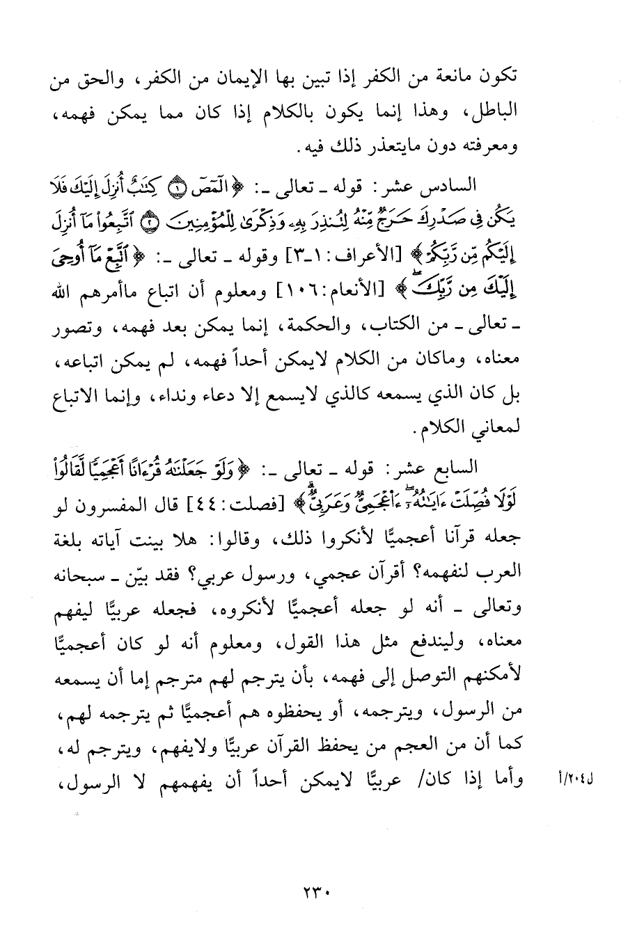 تكون مانعة من الكفر إذا تبين بها الإيمان من الكفر والحق من الباطل وهذا إنما يكون بالكلام إذا كان مما يمكن فهمه ومعرفته دون ما يتعذر ذلك فيه السادس عشر قوله تعالى المص (1) كِتَابٌ أُنْزِلَ إِلَيْكَ فَلَا يَكُنْ فِي صَدْرِكَ حَرَجٌ مِنْهُ لِتُنْذِرَ بِهِ وَذِكْرَى لِلْمُؤْمِنِينَ (2) اتَّبِعُوا مَا أُنْزِلَ إِلَيْكُمْ مِنْ رَبِّكُمْ [الأعراف 1-3] وقوله تعالى اتَّبِعْ مَا أُوحِيَ إِلَيْكَ مِنْ رَبِّكَ [الأنعام 106] ومعلوم أن اتباع ما أمرهم الله تعالى من الكتاب والحكمة إنما يمكن بعد فهمه وتصور معناه وما كان من الكلام لا يمكن أحداً فهمه لم يمكن اتباعه بل كان الذي يسمعه كالذي لا يسمع إلا دعاء ونداء وإنما الاتباع لمعاني الكلام السابع عشر قوله تعالى وَلَوْ جَعَلْنَاهُ قُرْآنًا أَعْجَمِيًّا لَقَالُوا لَوْلَا فُصِّلَتْ آيَاتُهُ أَأَعْجَمِيٌّ وَعَرَبِيٌّ [فصلت 44] قال المفسرون لو جعله قرآنا أعجميًّا لأنكروا ذلك وقالوا هلا بينت آياته بلغة العرب لنفهمه أقرآن عجمي ورسول عربي فقد بيّن سبحانه وتعالى أنه لو جعله أعجميًّا لأنكروه فجعله عربيًّا ليفهم معناه وليندفع مثل هذا القول ومعلوم أنه لو كان أعجميًّا لأمكنهم التوصل إلى فهمه بأن يترجم لهم مترجم إما أن يسمعه من الرسول ويترجمه أو يحفظوه هم أعجميًّا ثم يترجمه لهم كما أن من العجم من يحفظ القرآن عربيًّا ولا يفهم ويترجم له وأما إذا كان عربيًّا لا يمكن أحداً أن يفهمهم إلا الرسول