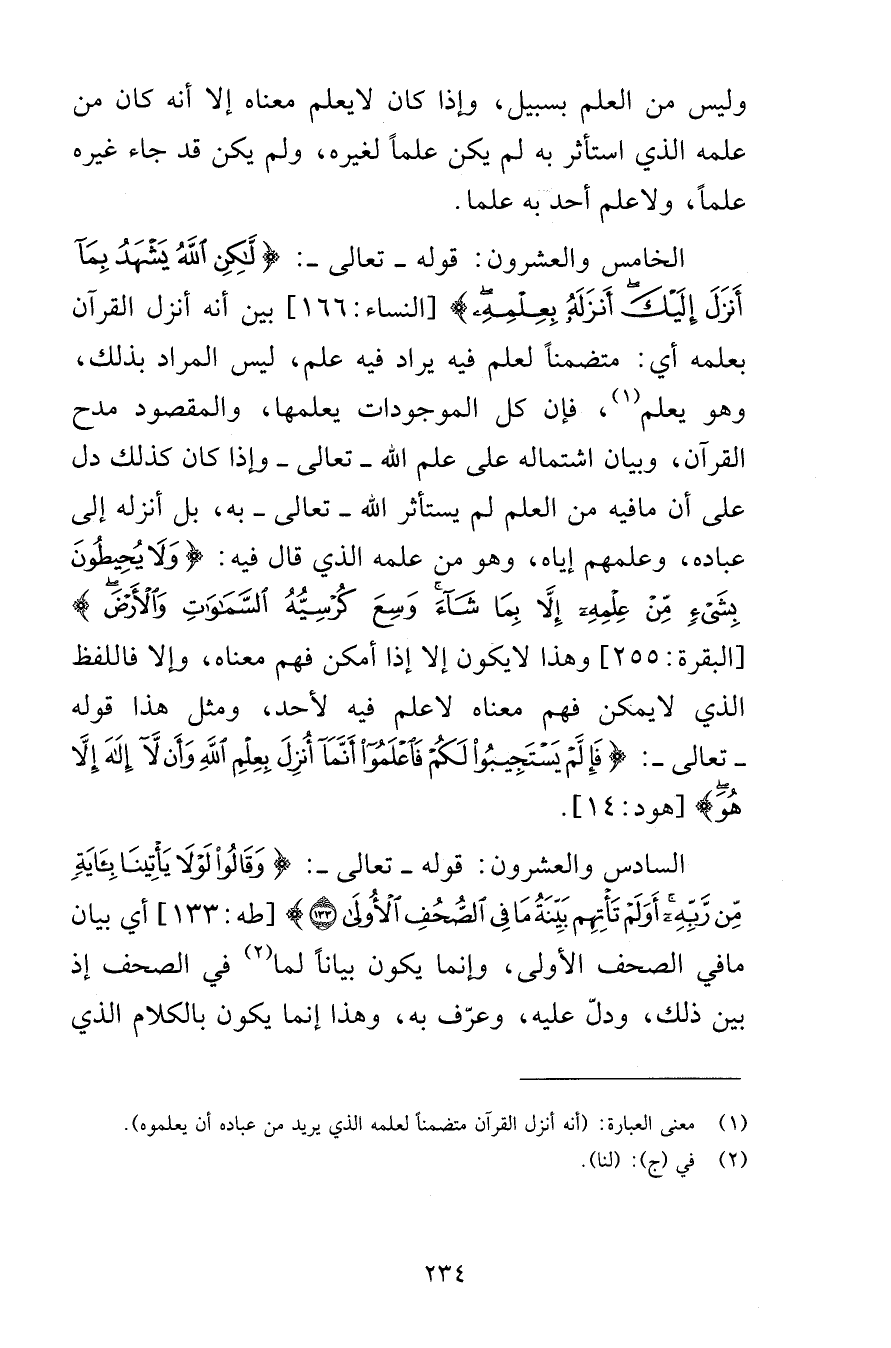 وليس من العلم بسبيل وإذا كان لا يعلم معناه إلا أنه كامن من علمه الذي استأثر به لم يكن علماً لغيره ولم يكن قد جاء غيره علماً ولا علم أحد به علما الخامس والعشرون قوله تعالى لَكِنِ اللَّهُ يَشْهَدُ بِمَا أَنْزَلَ إِلَيْكَ أَنْزَلَهُ بِعِلْمِهِ [النساء 166] بين أنه أنزل القرآن بعلمه أي متضمناً لعلم فيه يراد فيه علم ليس المراد بذلك وهو يعلم فإن كل الموجودات يعلمها والمقصود مدح القرآن وبيان اشتماله على علم الله تعالى وإذا كان كذلك دل على أن ما فيه من العلم لم يستأثر الله تعالى به بل أنزله إلى عباده وعلمهم إياه وهو من علمه الذي قال فيه وَلَا يُحِيطُونَ بِشَيْءٍ مِنْ عِلْمِهِ إِلَّا بِمَا شَاءَ وَسِعَ كُرْسِيُّهُ السَّمَاوَاتِ وَالْأَرْضَ [البقرة 255] وهذا لا يكون إلا إذا أمكن فهم معناه وإلا فاللفظ الذي لا يمكن فهم معناه لا علم فيه لأحد ومثل هذا قوله تعالى فَإِلَّمْ يَسْتَجِيبُوا لَكُمْ فَاعْلَمُوا أَنَّمَا أُنْزِلَ بِعِلْمِ اللَّهِ وَأَنْ لَا إِلَهَ إِلَّا هُوَ [هود 14] السادس والعشرون قوله تعالى وَقَالُوا لَوْلَا يَأْتِينَا بِآيَةٍ مِنْ رَبِّهِ أَوَلَمْ تَأْتِهِمْ بَيِّنَةُ مَا فِي الصُّحُفِ الْأُولَى (133) [طه 133] أي بيان ما في الصحف الأولى وإنما يكون بياناً لما في الصحف إذ بين ذلك ودلّ عليه وعرّف به وهذا إنما يكون بالكلام الذي