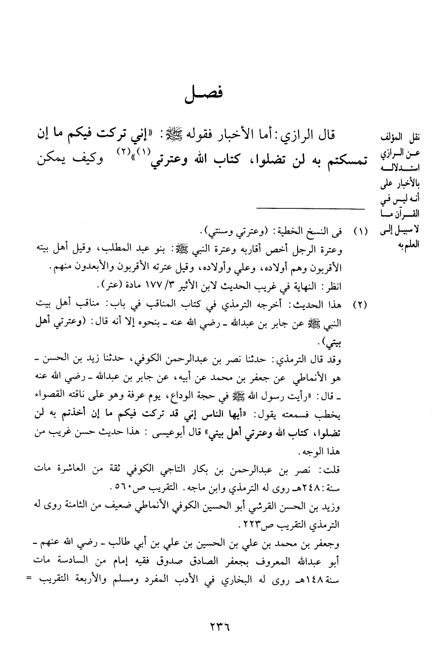 فصل قال الرازي أما الأخبار فقوله صلى الله عليه وسلم إني تركت فيكم ما إن تمسكتم به لن تضلوا كتاب الله وعترتي وكيف يمكن