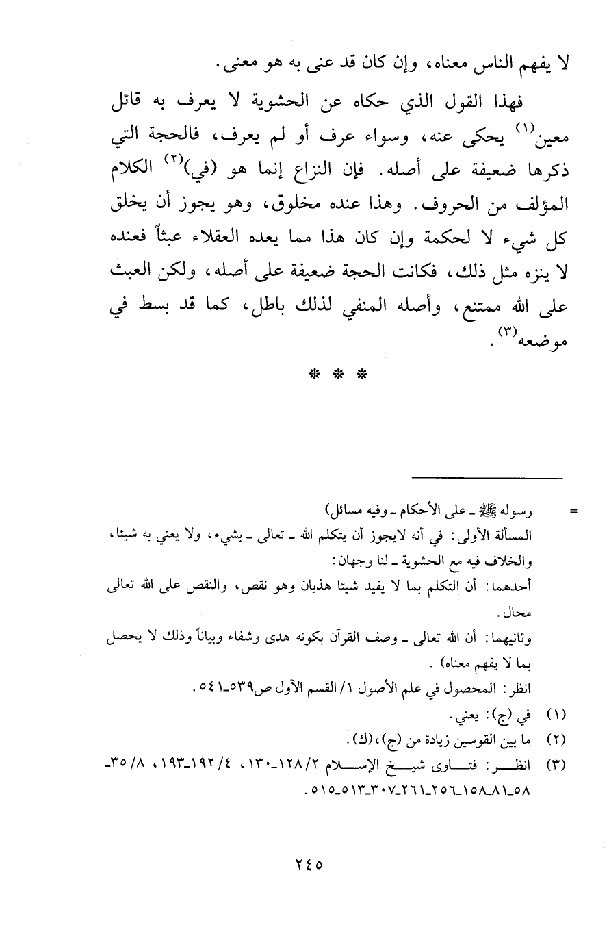 لا يفهم الناس معناه وإن كان قد عنى به هو معنى فهذا القول الذي حكاه عن الحشوية لا يعرف به قائل معين يحكى عنه وسواء عرف أو لم يعرف فالحجة التي ذكرها ضعيفة على أصله فإن النزاع إنما هو في الكلام المؤلف من الحروف وهذا عنده مخلوق وهو يجوز أن يخلق كل شيء لا لحكمة وإن كان هذا مما يعده العقلاء عبثاً فعنده لا ينزه مثل ذلك فكانت الحجة ضعيفة على أصله ولكن العبث على الله ممتنع وأصله المنفي لذلك باطل كما قد بسط في موضعه