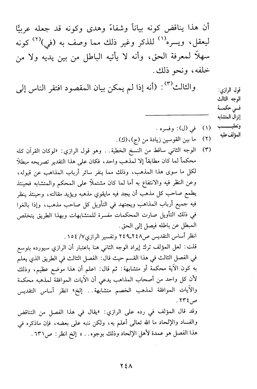 أن هذا يناقض كونه بياناً وشفاءً وهدى وكونه قد جعله عربيًّا ليعقل ويسره للذكر وغير ذلك مما وصف به في كونه سهلاً لمعرفة الحق وأنه لا يأتيه الباطل من بين يديه ولا من خلفه ونحو ذلك والثالث أنه إذا لم يمكن بيان المقصود افتقر الناس إلى