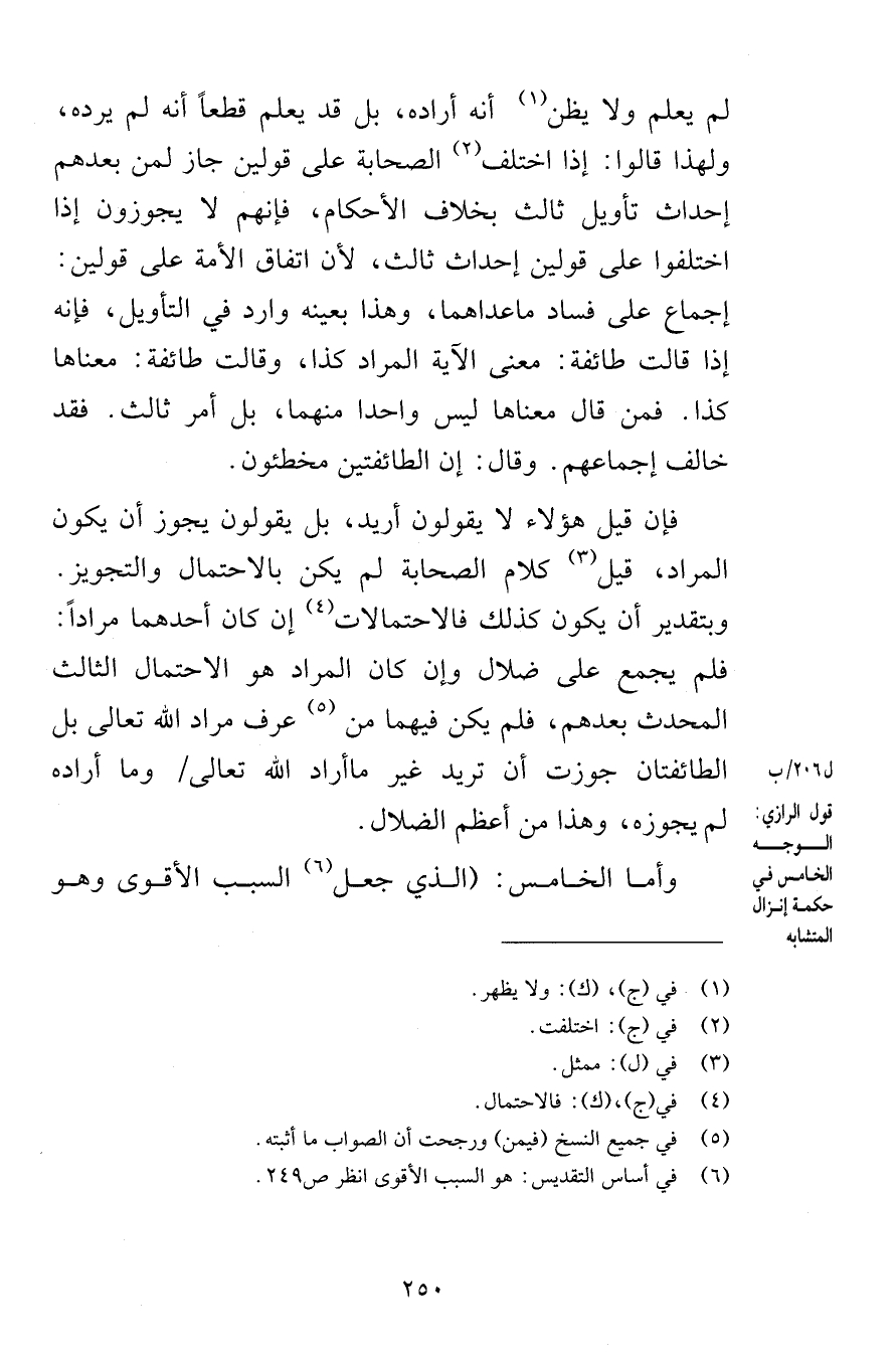 لم يعلم ولا يظن أنه أراده بل قد يعلم قطعاً أنه لم يرده ولهذا قالوا إذا اختلف الصحابة على قولين جاز لمن بعدهم إحداث تأويل ثالث بخلاف الأحكام فإنهم لا يجوزون إذا اختلفوا على قولين إحداث ثالث لأن اتفاق الأمة على قولين إجماع على فساد ما عداهما وهذا بعينه وارد في التأويل فإنه إذا قالت طائفة معنى الآية المراد كذا وقالت طائفة معناها كذا فمن قال معناها ليس واحدا منهما بل أمر ثالث فقد خالف إجماعهم وقال إن الطائفتين مخطئون فإن قيل هؤلاء لا يقولون أريد بل يقولون يجوز أن يكون المراد قيل كلام الصحابة لم يكن بالاحتمال والتجويز وبتقدير أن يكون كذلك فالاحتمالات إن كان أحدهما مراداً فلم يجمع على ضلال وإن كان المراد هو الاحتمال الثالث المحدث بعدهم فلم يكن فيهما من عرف مراد الله تعالى بل الطائفتان جوزت أن تريد غير ما أراد الله تعالى وما أراده لم يجوزه وهذا من أعظم الضلال وأما الخامس الذي جعل السبب الأقوى وهو