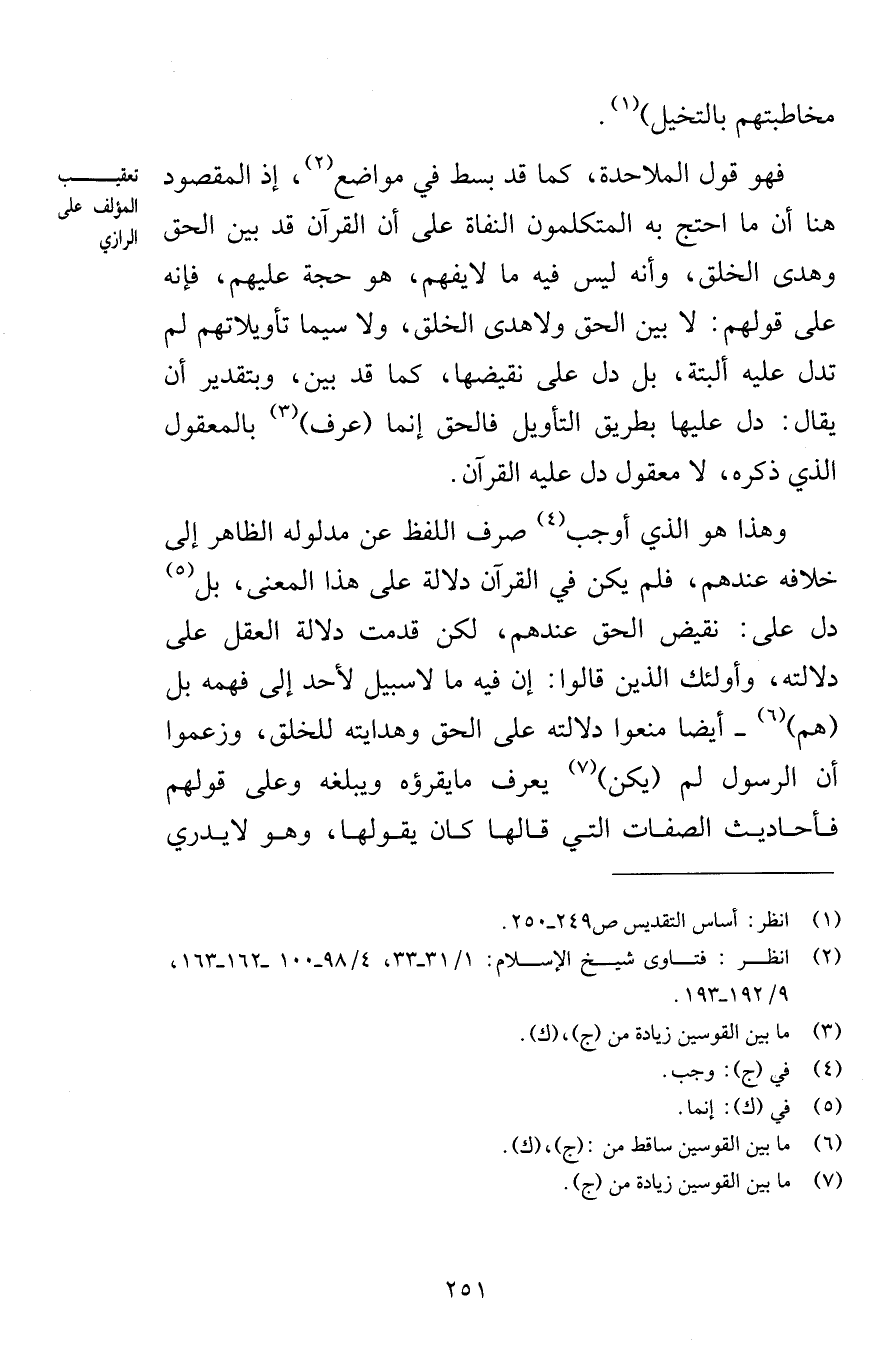 مخاطبتهم بالتخيل فهو قول الملاحدة كما قد بسط في مواضع إذ المقصود هنا أن ما احتج به المتكلمون النفاة على أن القرآن قد بين الحق وهدى الخلق وأنه ليس فيه ما لا يفهم وهو حجة عليهم فإنه على قولهم لا بين الحق ولا هدى الخلق ولا سيما تأويلاتهم لم تدل عليه ألبتة بل دل على نقيضها كما قد بين وبتقدير أن يقال دل عليها بطريق التأويل فالحق إنما عرف بالمعقول الذي ذكره لا معقول دل عليه القرآن وهذا هو الذي أوجب صرف اللفظ عن مدلوله الظاهر إلى خلافه عندهم فلم يكن في القرآن دلالة على هذا المعنى بل دل على نقيض الحق عندهم لكن قدمت دلالة العقل على دلالته وأولئك الذين قالوا إن فيه ما لا سبيل لأحد إلى فهمه بل هم أيضا منعوا دلالته على الحق وهدايته للخلق وزعموا أن الرسول لم يكن يعرف ما يقرؤه ويبلغه وعلى قولهم فأحاديث الصفات التي قالها كان يقولها وهو لا يدري