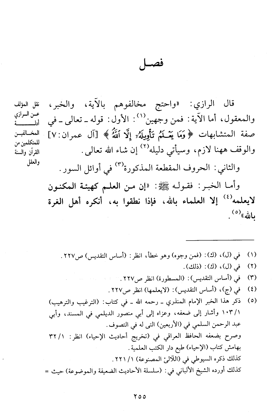 فصل قال الرازي واحتج مخالفوهم بالآية والخبر والمعقول أما الآية فمن وجهين الأول قوله تعالى في صفة المتشابهات وَمَا يَعْلَمُ تَأْوِيلَهُ إِلَّا اللَّهُ [آل عمران 7] والوقف ههنا لازم وسيأتي دليله إن شاء الله تعالى والثاني الحروف المقطعة المذكورة في أوائل السور وأما الخبر فقوله صلى الله عليه وسلم إن من العلم كهيئة المكنون لا يعلمه إلا العلماء بالله فإذا نطقوا به أنكره أهل الغرة بالله