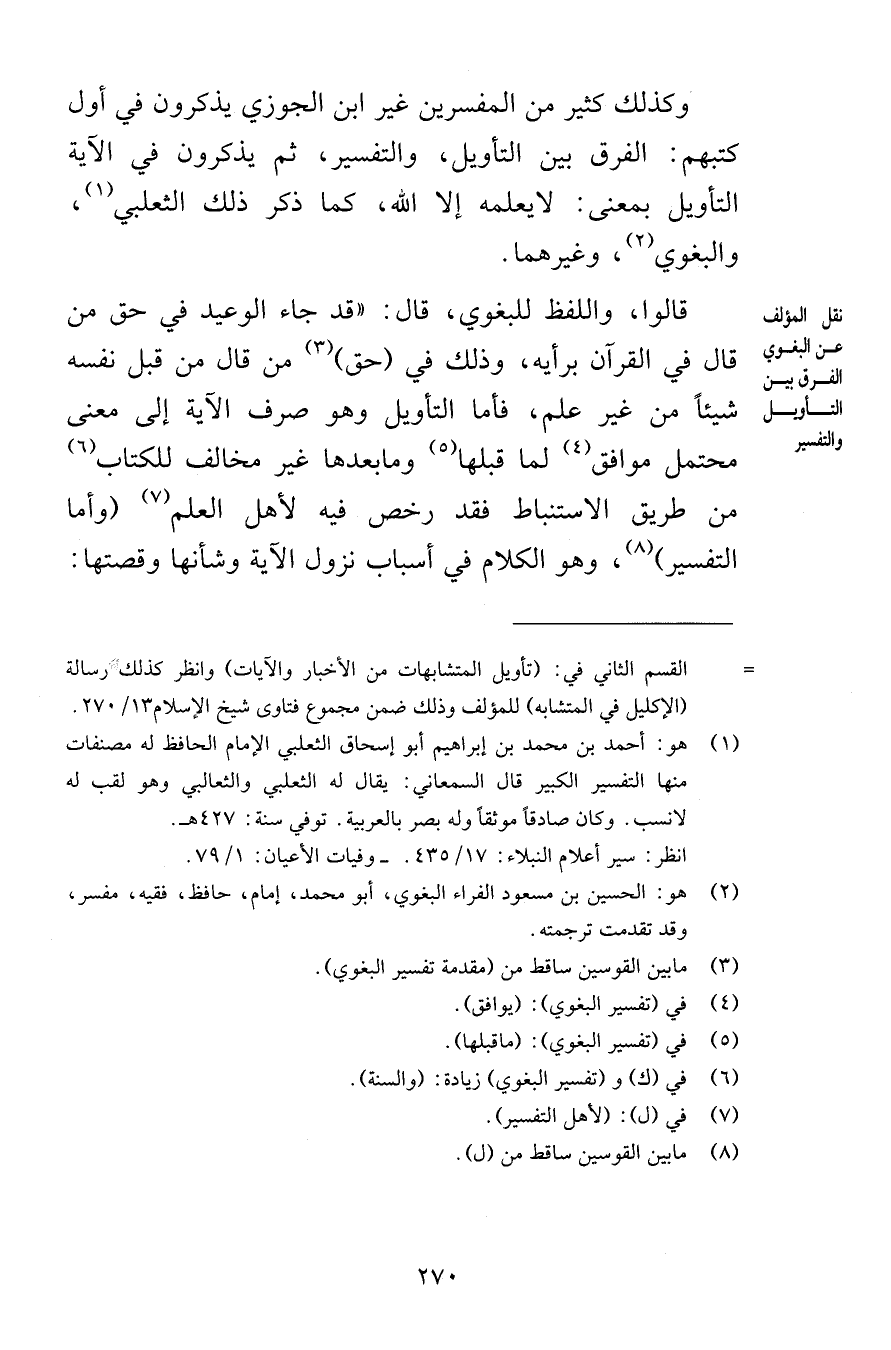 وكذلك كثير من المفسرين غير ابن الجوزي يذكرون في أول كتبهم الفرق بين التأويل والتفسير ثم يذكرون في الآية التأويل بمعنى لا يعلمه إلا الله كما ذكر ذلك الثعلبي والبغوي وغيرهما قالوا واللفظ للبغوي قال قد جاء الوعيد في حق من قال في القرآن برأيه وذلك في حق من قال من قبل نفسه شيئاً من غير علم فأما التأويل وهو صرف الآية إلى معنى محتمل موافق لما قبلها وما بعدها غير مخالف للكتاب من طريق الاستنباط فقد رخص فيه لأهل العلم وأما التفسير وهو الكلام في أسباب نزول الآية وشأنها وقصتها