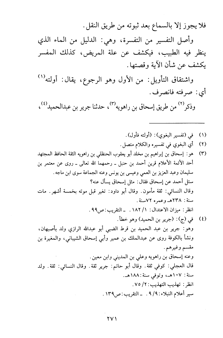 فلا يجوز إلا بالسماع بعد ثبوته من طريق النقل واصل التفسير من التفسرة وهي الدليل من الماء الذي ينظر فيه الطبيب فيكشف عن علة المريض كذلك المفسر يكشف عن شأن الآية وقصتها واشتقاق التأويل من الأول وهو الرجوع يقال أولته أي صرفته فانصرف وذكر من طريق إسحاق بن راهوية حدثنا جرير بن عبد الحميد