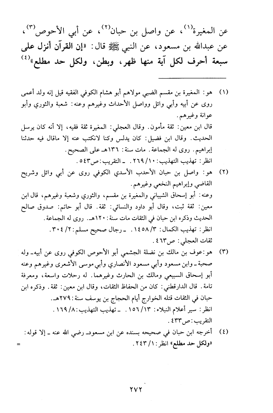 عن المغيرة عن واصل بن حبان عن أبي الأحوص عن عبد الله بن مسعود عن النبي صلى الله عليه وسلم قال إن القرآن أنزل على سبعة أحرف لكل آية منها ظهر وبطن ولكل حد مطلع