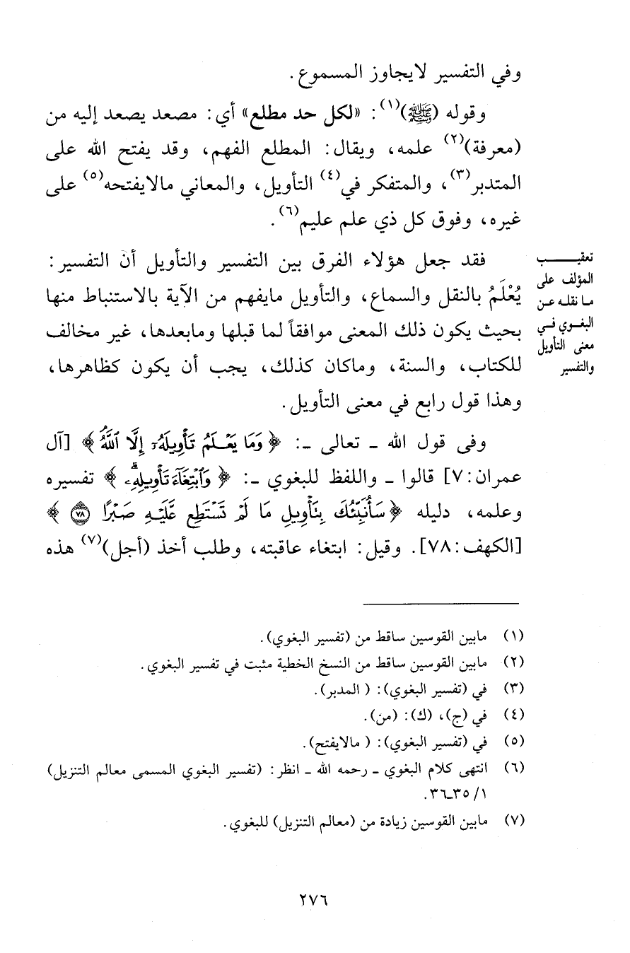 وفي التفسير لا يجاوز المسموع وقوله صلى الله عليه وسلم لكل حد مطلع أي مصعد يصعد إليه من معرفة علمه ويقال المطلع الفهم وقد يفتح الله على المتدبر والمتفكر في التأويل والمعاني ما لا يفتحه على غيره وفوق كل ذي علم عليم فقد جعل هؤلاء الفرق بين التفسير والتأويل أن التفسير يُعْلَمُ بالنقل والسماع والتأويل ما يفهم من الآية بالاستنباط منها بحيث يكون ذلك المعنى موافقاً لما قبلها وما بعدها غير مخالف للكتاب والسنة وما كان كذلك يجب أن يكون كظاهرها وهذا قول رابع في معنى التأويل وفي قول الله تعالى وَمَا يَعْلَمُ تَأْوِيلَهُ إِلَّا اللَّهُ [آل عمران 7] قالوا واللفظ للبغوي وَابْتِغَاءَ تَأْوِيلِهِ تفسيره وعلمه دليله سَأُنَبِّئُكَ بِتَأْوِيلِ مَا لَمْ تَسْتَطِعْ عَلَيْهِ صَبْرًا (78) [الكهف 78] وقيل ابتغاء عاقبته وطلب أخذ اجل هذه