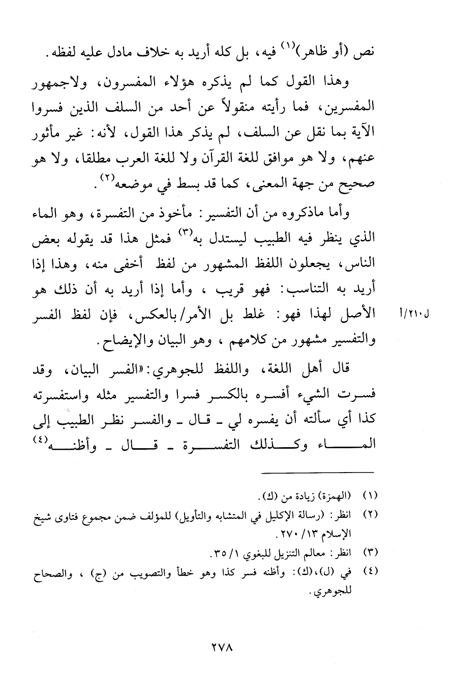 نص أو ظاهر فيه بل كله أريد به خلاف مادل عليه لفظه وهذا القول كما لم يذكره هؤلاء المفسرون ولا جمهور المفسرين فما رأيته منقولاً عن أحد من السلف الذين فسروا الآية بما نقل عن السلف لم يذكر هذا القول لأنه غير مأثور عنهم ولا هو موافق للغة القرآن ولا للغة العرب مطلقا ولا هو صحيح من جهة المعنى كما قد بسط في موضعه وأما ما ذكروه من أن التفسير مأخوذ من التفسرة وهو الماء الذي ينظر فيه الطبيب ليستدل به فمثل هذا قد يقوله بعض الناس يجعلون اللفظ المشهور من لفظ أخفى منه وهذا إذا أريد به التناسب فهو قريب وأما إذا أريد به أن ذلك هو الأصل لهذا فهو غلط بل الأمر بالعكس فإن لفظ الفسر والتفسير مشهور من كلامهم وهو البيان والإيضاح قال أهل اللغة واللفظ للجوهري الفسر البيان وقد فسرت الشيء أفسره بالكسر فسرا والتفسير مثله واستفسرته كذا أي سألته أن يفسره لي قال والفسر نظر الطبيب إلى الماء وكذلك التفسرة قال وأظنه