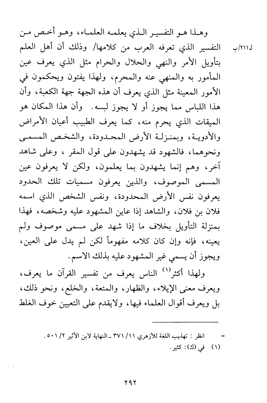 وهذا هو التفسير الذي يعلمه العلماء وهو أخص من التفسير الذي تعرفه العرب من كلامها وذلك أن أهل العلم بتأويل الأمر والنهي والحلال والحرام مثل الذي يعرف عين المأمور به والمنهي عنه والمحرم ولهذا يفتون ويحكمون في الأمور المعينة مثل الذي يعرف أن هذه الجهة جهة الكعبة وأن هذا اللباس مما يجوز أو لا يجوز لبسه وأن هذا المكان هو الميقات الذي يحرم منه كما يعرف الطبيب أعيان الأمراض والأدوية وبمنزلة الأرض المحدودة والشخص المسمى ونحوهما فالشهود قد يشهدون على قول المقر وعلى شاهد آخر وهم إنما يشهدون بما يعلمون ولكن لا يعرفون عين المسمى الموصوف والذين يعرفون مسميات تلك الحدود يعرفون نفس الأرض المحدودة ونفس الشخص الذي اسمه فلان بن فلان والشاهد إذا عاين المشهود عليه وشخصه فهذا بمنزلة التأويل بخلاف ما إذا شهد على مسمى موصوف ولم يعينه فإنه وإن كان كلامه مفهوماً لكن لم يدل على العين ويجوز أن يسمي غير المشهود عليه بذلك الاسم ولهذا أكثر الناس يعرف من تفسير القرآن ما يعرف ويعرف معنى الإيلاء والظهار والمتعة والخلع ونحو ذلك بل ويعرف أقوال العلماء فيها ولا يقدم على التعيين خوف الغلط