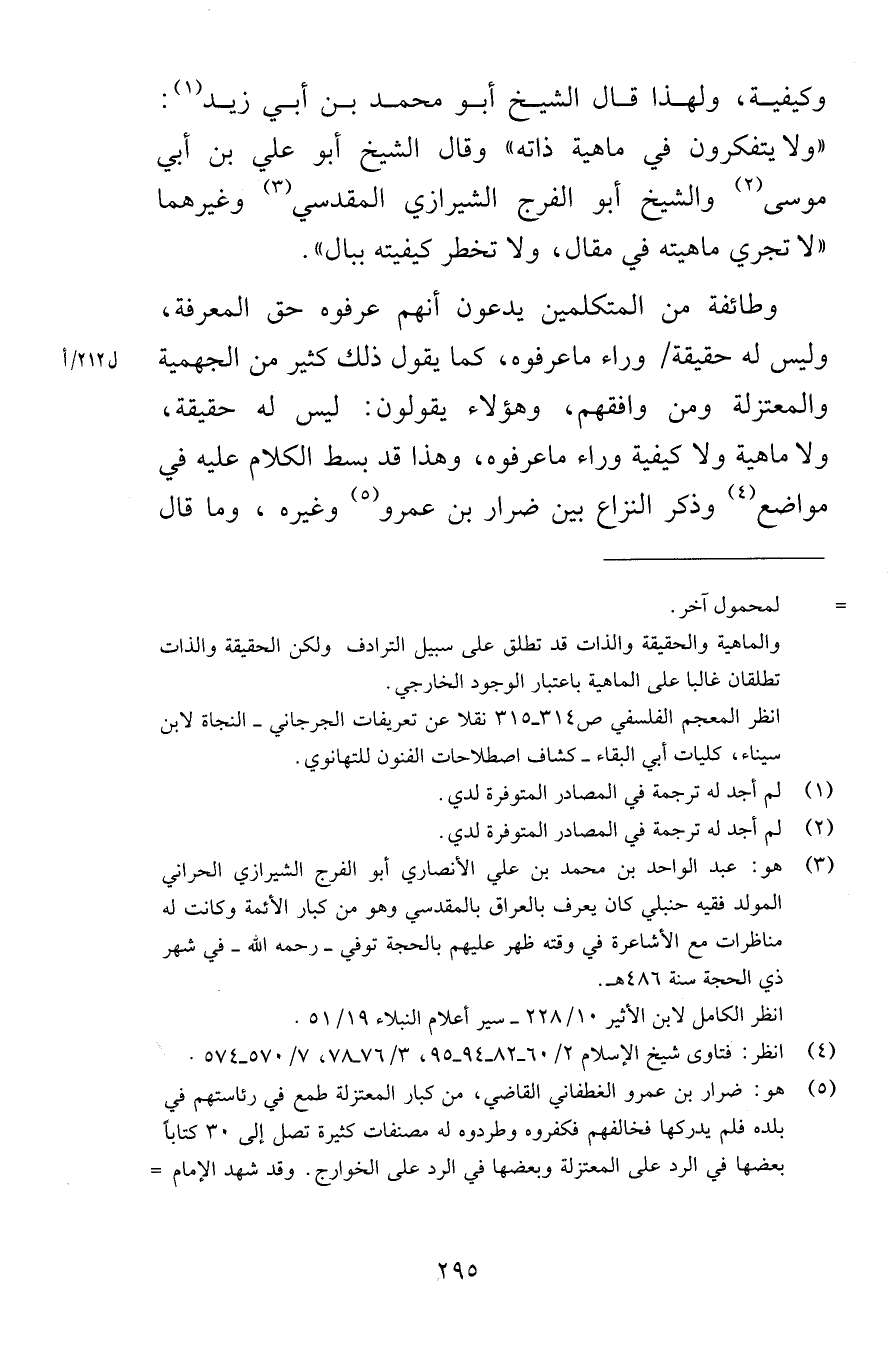 وكيفية ولهذا قال الشيخ أبو محمد بن أبي زيد ولا يتفكرون في ماهية ذاته وقال الشيخ أبو علي بن أبي موسى والشيخ أبو الفرج الشيرازي المقدسي وغيرهما لا تجري ماهيته في مقال ولا تخطر كيفيته ببال وطائفة من المتكلمين يدعون أنهم عرفوه حق المعرفة وليس له حقيقة وراء ما عرفوه كما يقول ذلك كثير من الجهمية والمعتزلة ومن وافقهم وهؤلاء يقولون ليس له حقيقة ولا ماهية ولا كيفية وراء ما عرفوه وهذا قد بسط الكلام عليه في مواضع وذكر النزاع بين ضرار بن عمرو وغيره وما قال