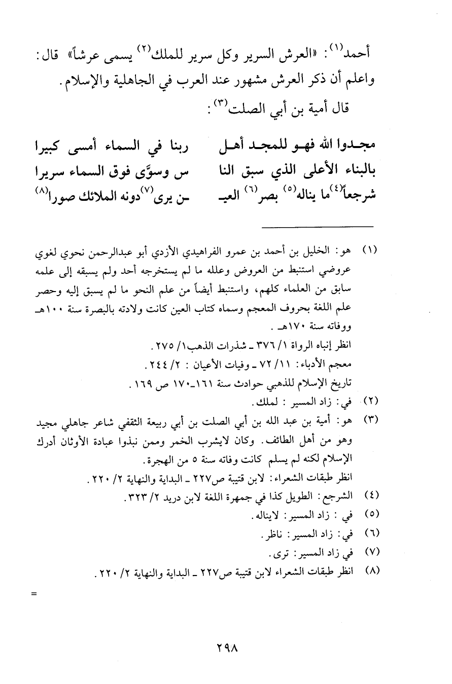 أحمد العرش السرير وكل سرير للملك يسمى عرشاً قال واعلم أن ذكر العرش مشهور عند العرب في الجاهلية والإسلام قال أمية بن أبي الصلت مجدوا الله فهو للمجد أهل ربنا في السماء أمسى كبيرا بالبناء الأعلى الذي سبق النا س وسوَّى فوق السماء سريرا شرجعاً ما يناله بصر العيـ ـن يرى دونه الملائك صورا
