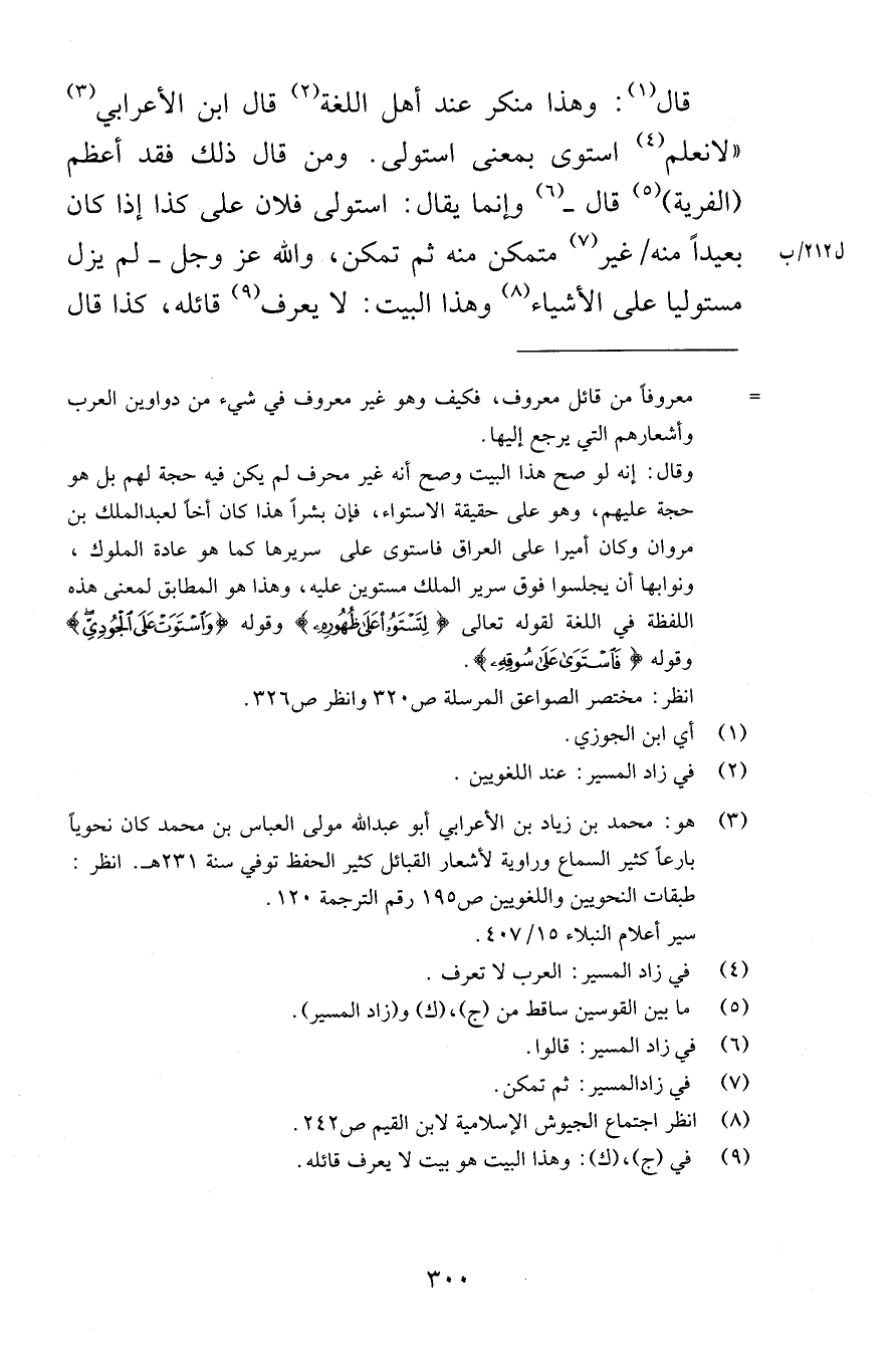 قال وهذا منكر عند أهل اللغة قال ابن الأعرابي لا نعلم استوى بمعنى استولى ومن قال ذلك فقد أعظم الفرية قال وإنما يقول استولى فلان على كذا إذا كان بعيداً منه غير متمكن منه ثم تمكن والله عز وجل لم يزل مستوليا على الأشياء وهذا البيت لا يعرف قائله كذا قال