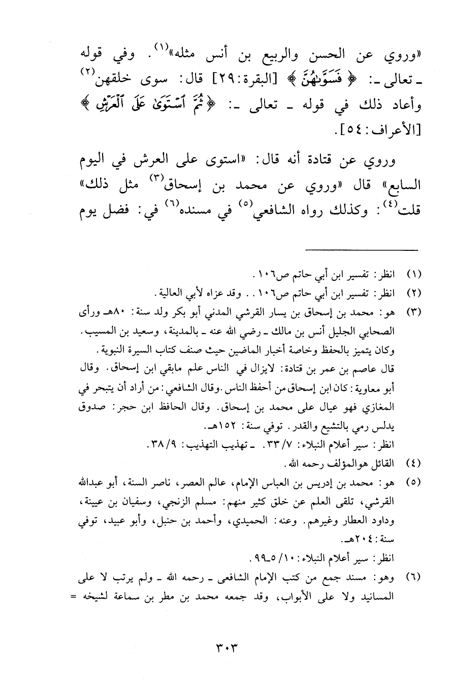 وروي عن الحسن والربيع بن أنس مثله وفي قوله تعالى فَسَوَّاهُنَّ [البقرة 29] قال سوى خلقهن وأعاد ذلك في قوله تعالى ثُمَّ اسْتَوَى عَلَى الْعَرْشِ [الأعراف 54] وروي عن قتادة أنه قال استوى على العرش في اليوم السابع قال وروي عن محمد بن إسحاق مثل ذلك قلت وكذلك رواه الشافعي في مسنده في فضل يوم