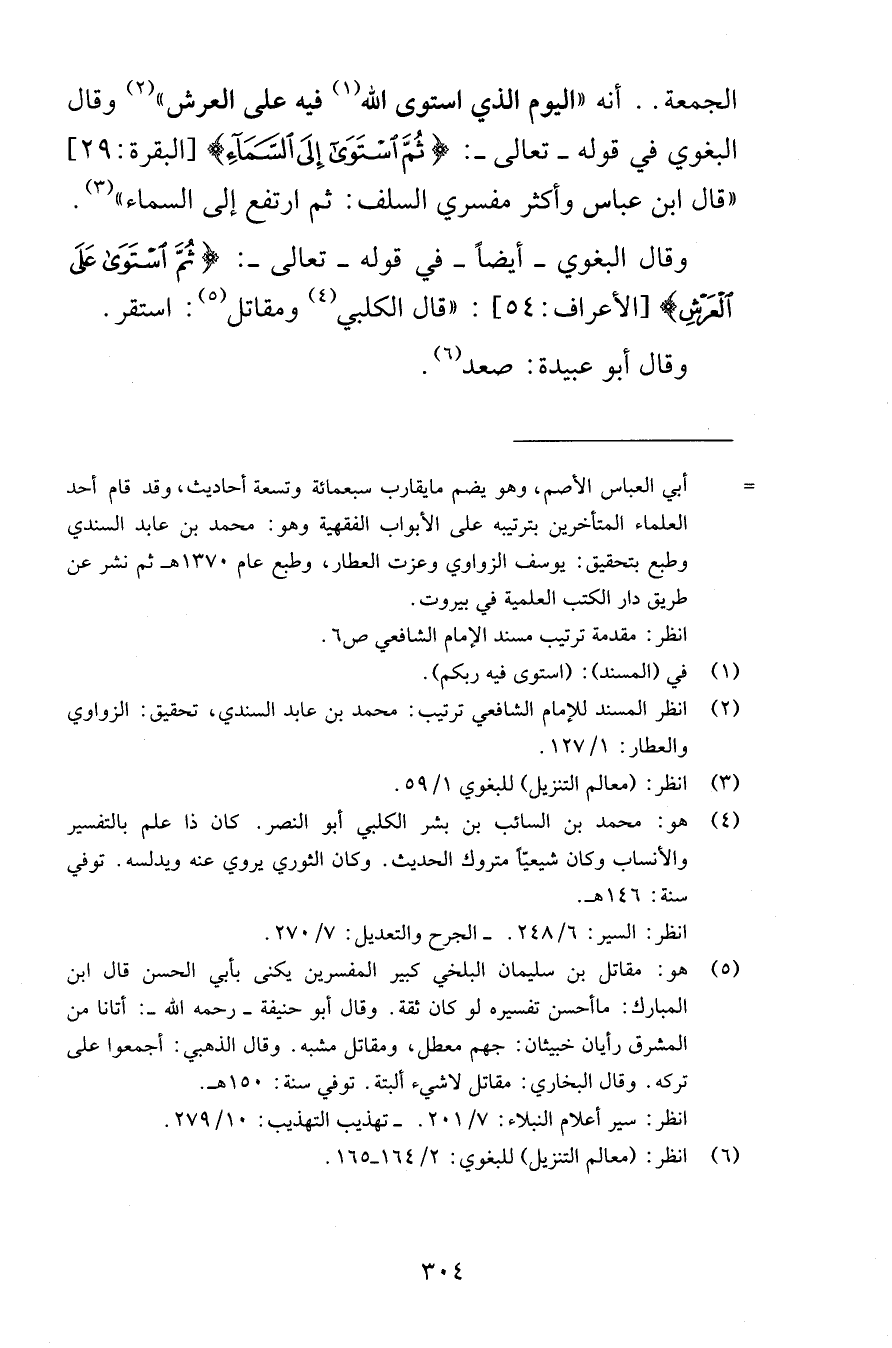 الجمعة أنه اليوم الذي استوى الله فيه على العرش وقال البغوي في قوله تعالى ثُمَّ اسْتَوَى إِلَى السَّمَاءِ [البقرة 29] قال ابن عباس وأكثر مفسري السلف ثم ارتفع إلى السماء وقال البغوي أيضاً في قوله تعالى