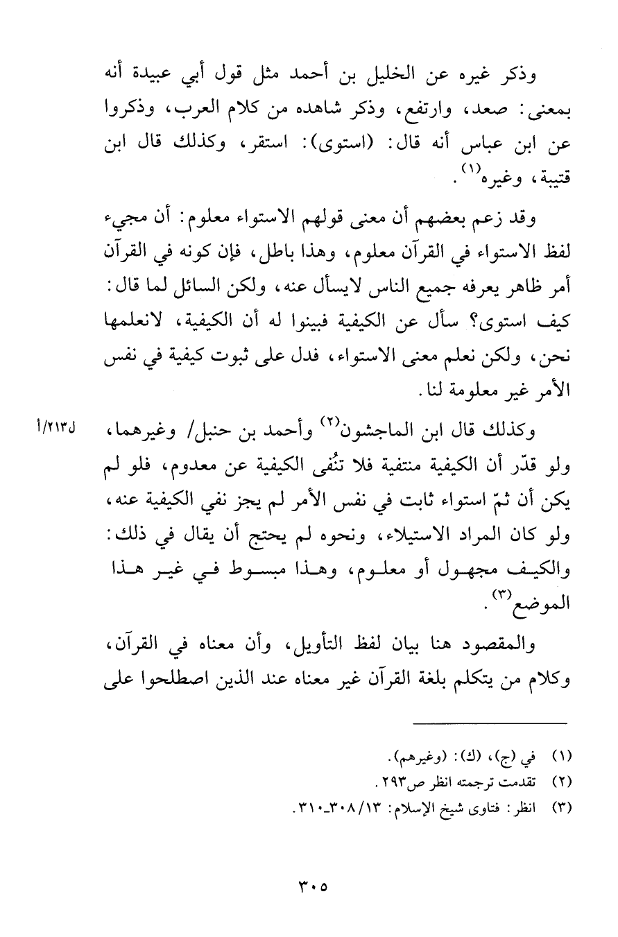 وذكر غيره عن الخليل بن أحمد مثل قول أبي عبيدة أنه بمعنى صعد وارتفع وذكر شاهده من كلام العرب وذكروا عن ابن عباس أنه قال استوى استقر وكذلك قال ابن قتيبة وغيره وقد زعم بعضهم أن معنى قولهم الاستواء معلوم أن مجيء لفظ الاستواء في القرآن معلوم وهذا باطل فإن كونه في القرآن أمر ظاهر يعرفه جميع الناس لا يسأل عنه ولكن السائل لما قال كيف استوى سأل عن الكيفية فبينوا له أن الكيفية لا نعلمها نحن ولكن نعلم معنى الاستواء فدل على ثبوت كيفية في نفس الأمر غير معلومة لنا وكذلك قال ابن الماجشون وأحمد بن حنبل وغيرهما ولو قدّر أن الكيفية منتفية فلا تنُفى الكيفية عن معدوم فلو لم يكن أن ثمّ استواء ثابت في نفس الأمر لم يجز نفي الكيفية عنه ولو كان المراد الاستيلاء ونحوه لم يحتج أن يقال في ذلك والكيف مجهول أو معلوم وهذا مبسوط في غير هذا الموضع والمقصود هنا بيان لفظ التأويل وأن معناه في القرآن وكلام من يتكلم بلغة القرآن غير معناه عند الذين اصطلحوا على