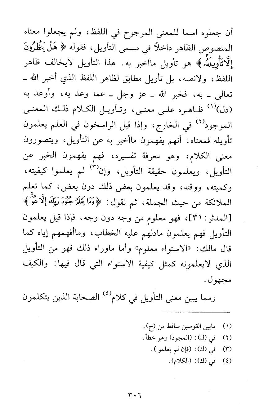 أن جعلوه اسما للمعنى المرجوح في اللفظ ولم يجعلوا معناه المنصوص الظاهر داخلاً في مسمى التأويل فقوله هَلْ يَنْظُرُونَ إِلَّا تَأْوِيلَهُ هو تأويل ما أخبر به هذا التأويل لا يخالف ظاهر اللفظ ولا نصه بل تأويل مطابق لظاهر اللفظ الذي أخبر الله تعالى به فخبر الله عز وجل عما وعد به وأوعد به دل ظاهره على معنى وتأويل الكلام ذلك المعنى الموجود في الخارج وإذا قيل الراسخون في العلم يعلمون تأويله فمعناه أنهم يفهمون ما أخبر به عن التأويل ويتصورون معنى الكلام وهو معرفة تفسيره فهم يفهمون الخبر عن التأويل ويعلمون حقيقة التأويل وإن لم يعلموا كيفيته وكميته ووقته وقد يعلمون بعض ذلك دون بعض كما تعلم الملائكة من حيث الجملة ثم نقول وَمَا يَعْلَمُ جُنُودَ رَبِّكَ إِلَّا هُوَ [المدثر 31] فهو معلوم من وجه دون وجه فإذا قيل يعلمون التأويل فهم يعلمون ما دلهم عليه الخطاب وما أفهمهم إياه كما قال مالك الاستواء معلوم وأما ما وراء ذلك فهو من التأويل الذي لا يعلمونه كمثل كيفية الاستواء التي قال فيها والكيف مجهول ومما يبين معنى التأويل في كلام الصحابة الذين يتكلمون