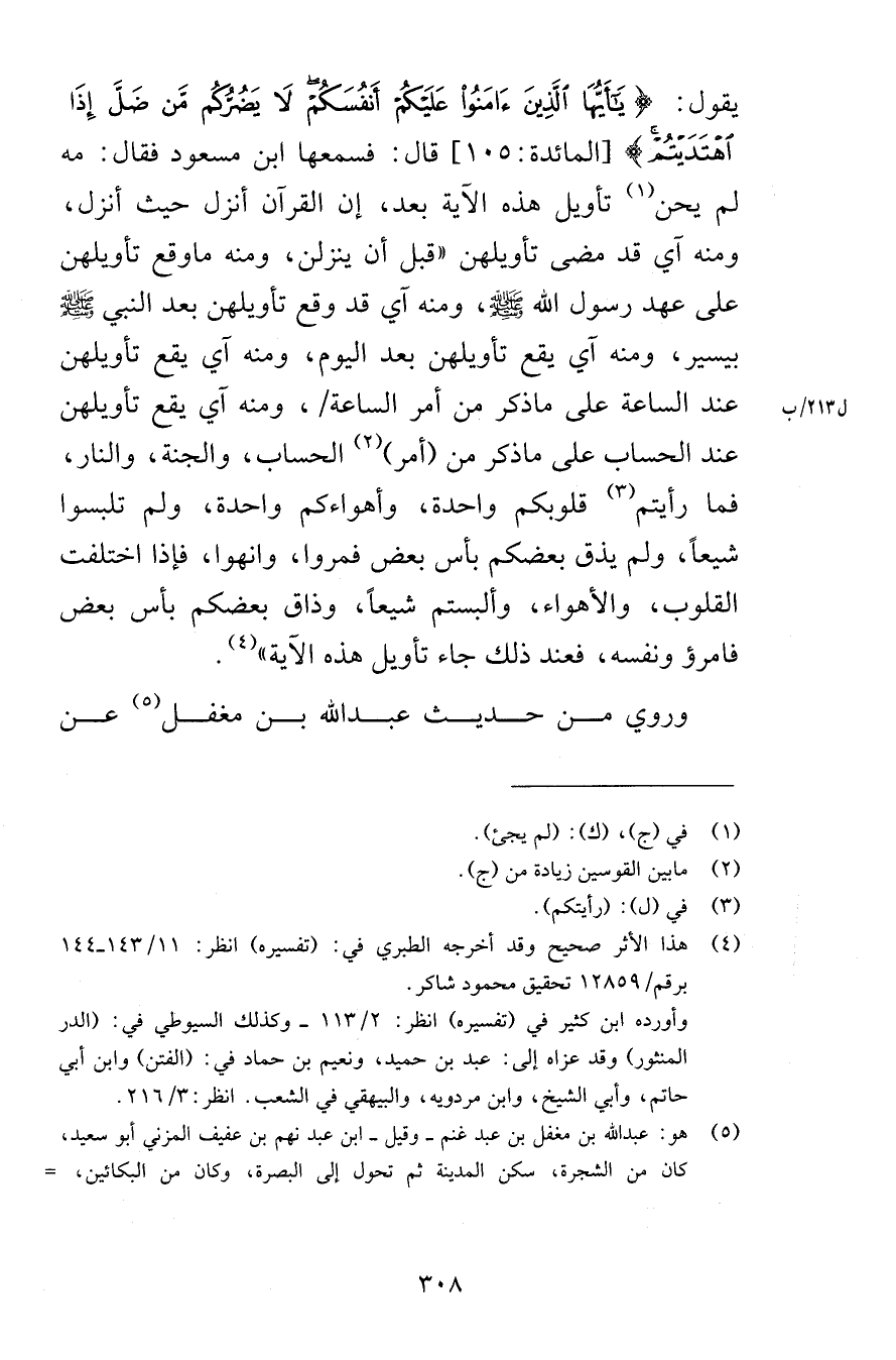 يقول يَا أَيُّهَا الَّذِينَ آمَنُوا عَلَيْكُمْ أَنْفُسَكُمْ لَا يَضُرُّكُمْ مَنْ ضَلَّ إِذَا اهْتَدَيْتُمْ [المائدة 105] قال فسمعها ابن مسعود فقال مه لم يحن تأويل هذه الآية بعد إن القرآن أنزل حيث أنزل ومنه آي قد مضى تأويلهن قبل أن ينزلن ومنه ما وقع تأويلهن على عهد رسول الله صلى الله عليه وسلم ومنه آي قد وقع تأويلهن بعد النبي صلى الله عليه وسلم بيسير ومنه آي يقع تأويلهن بعد اليوم ومنه آي يقع تأويلهن عند الساعة على ما ذكر من أمر الساعة ومنه آي يقع تأويلهن عند الحساب على ما ذكر من أمر الحساب والجنة والنار فما رأيت قلوبكم واحدة وأهواءكم واحدة ولم تلبسوا شيعاً ولم يذق بعضكم بأس بعض فمروا وانهوا فإذا اختلفت القلوب والأهواء وألبستم شيعاً وذاق بعضكم بأس بعض فامرؤ ونفسه فعند ذلك جاء تأويل هذه الآية وروي من حديث عبد الله بن مغفل عن